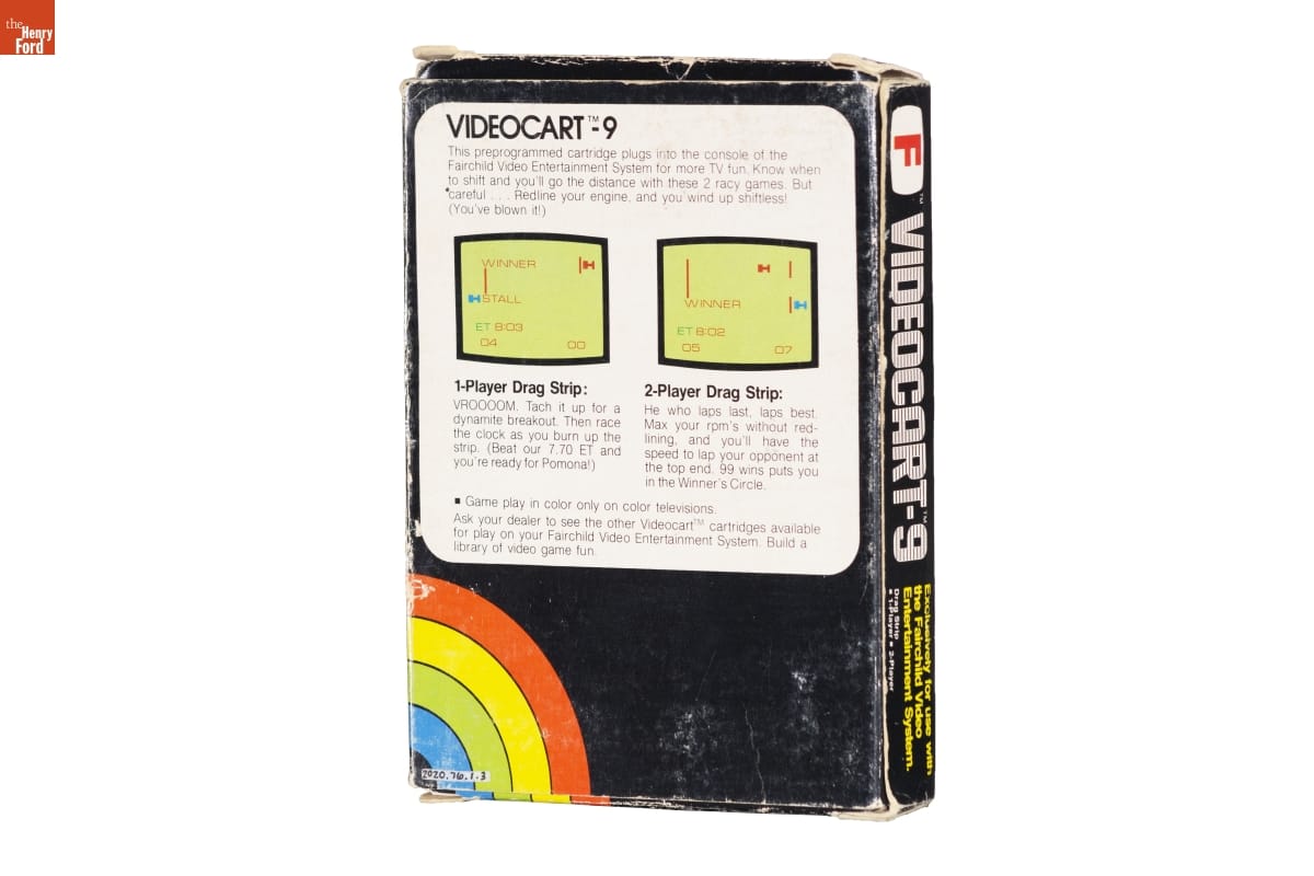 VIDEOCART-9 / This preprogrammed cartridge plugs into the console of the / Fairchild Video Entertainment System for more TV fun. Know when / to shift and you'll go the distance with these 2 racy games. But / careful...Redline your engine, and you wind up shiftless! / (You've blown it!) / 1-Player Drag Strip: / VROOOM. Tach it up for a / dynamite breakout. Then race / the clock as you burn up the / strip. (Beat our 7.70 ET and / you're ready for Pomona!) / 2-Player Drag Strip: / He who laps last, laps best. / Max your rpm's without red- / lining, and you'll have the / speed to lap your opponent at / the top end. 99 wins puts you in the Winner's Circle. / Game play in color only on color televisions. / Ask your dealer to see the other Videocart(TM) cartridges available / for play on your Fairchild Video Entertainment System. Build a / library of video game fun.