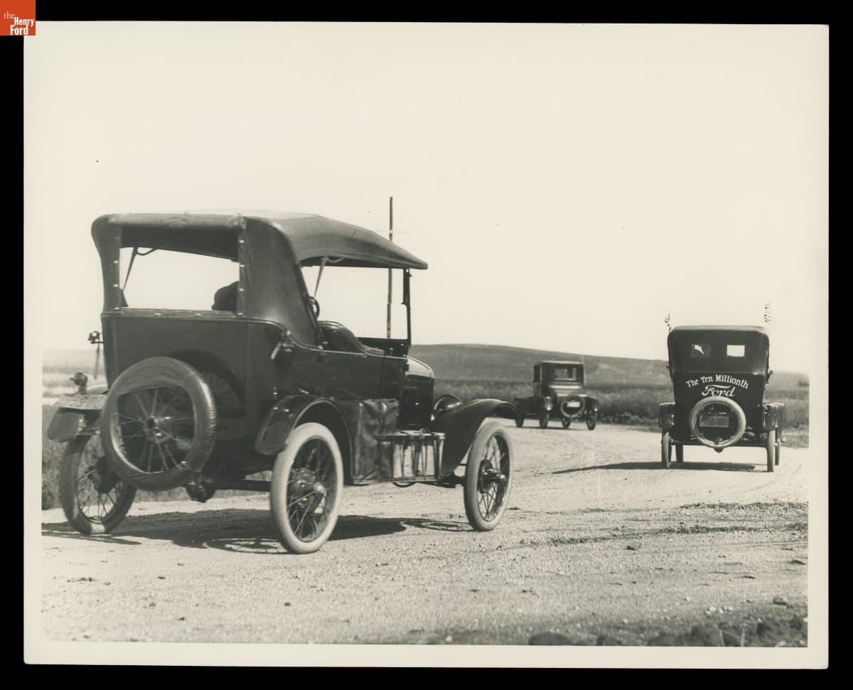 In June 1924, the ten millionth Ford automobile -- a Model T, of course -- rolled off the assembly line. Ford sent this vehicle on a cross-country tour promoting the company. Crowds greeted the car as it made its way from New York to California along the Lincoln Highway. This photo shows the ten millionth Ford traveling with two other Model Ts.