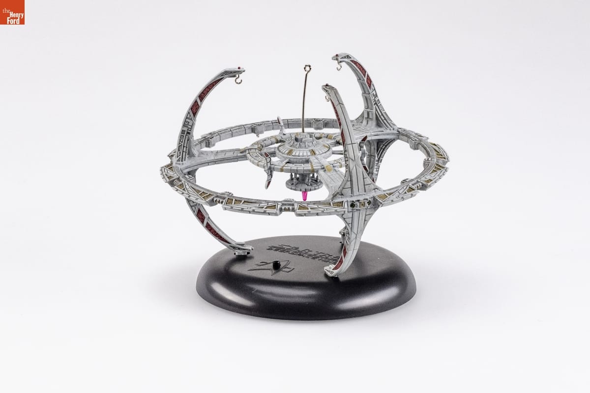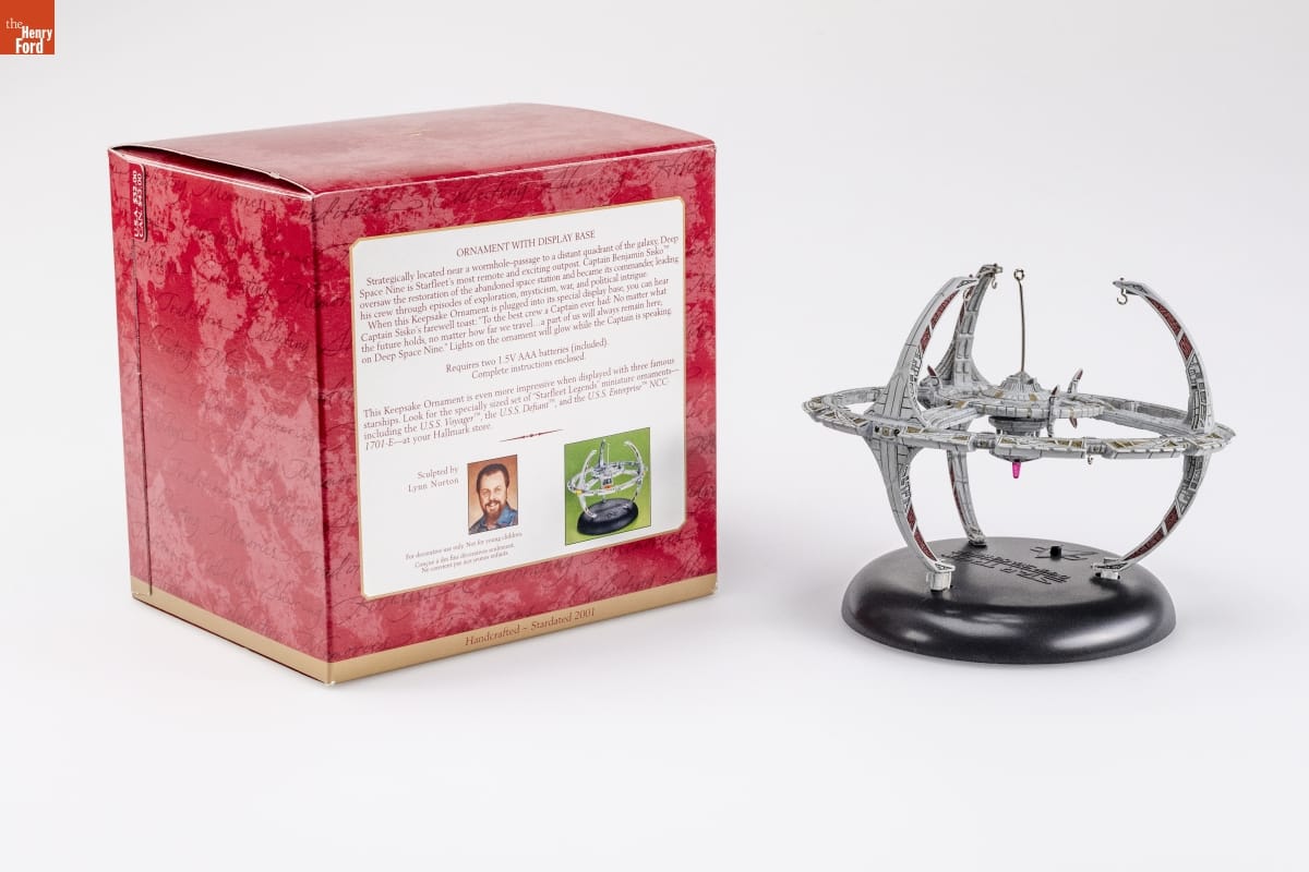 ORNAMENT WITH DISPLAY BASE / Strategically located near a wormhole-passage to a distant quadrant of the galaxy, Deep / Space Nine is Starfleet's most remote and exciting outpost. Captain Benjamin Sisko / oversaw the restoration of the abandoned space station and became its commander, leading / his crew through episodes of exploration, mysticism, war, and political intrigue. / When this Keepsake Ornament is plugged into its special display base, you can hear / Captain Sisko's farewell toast: "To the best crew a Captain ever had: No matter what / the future holds, no matter how far we travel...a part of us will always remain here, / on Deep Space Nine." Lights on the ornament will glow while the Captain is speaking. / Requires two 1.5V AAA batteries (included). / Complete instructions enclosed. / This Keepsake Ornament is even more impressive when displayed with three famous / starships. Look for the specially sized set of "Starfleet Legends" miniature ornaments--- / including the U.S.S. Voyager TM, the U.S.S. Defiant TM, and the U.S.S. Enterprise TM NCC- / 1701-E--at your Hallmark store. / Sculpted by / Lynn Norton / For decorative use only. Not for young children. / Concue a des fins decoratives seulement. / Ne convient pas aux jeaunes enfants. / Handcrafted - Stardated 2001