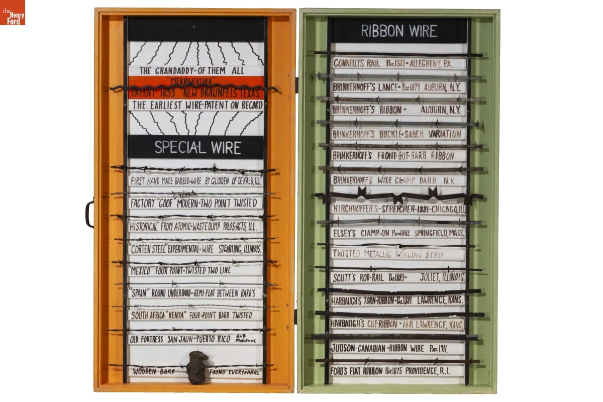 Display made by Ed Mulcrone of Hometown, Illinois. Barbed wires found in display made by numerous makers and patent date ranges from 1876-1894.