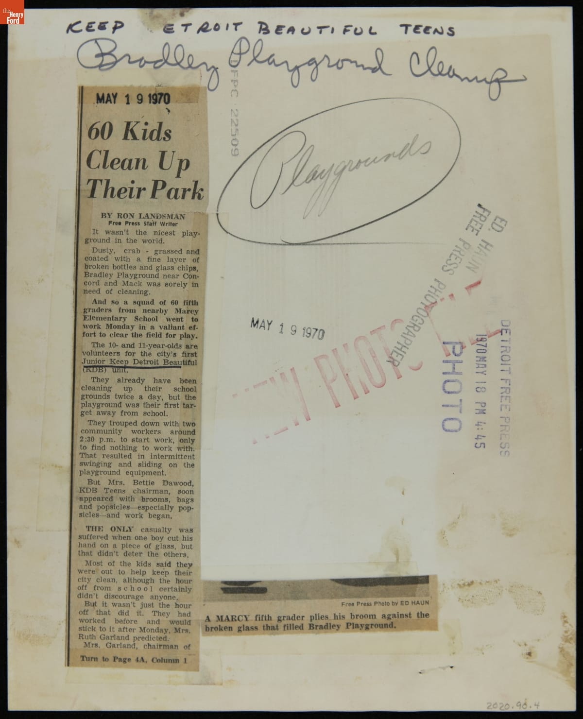 Marcy Elementary School Fifth Grader Sweeps the Sidewalk at Bradley Playground in Detroit, May 1970