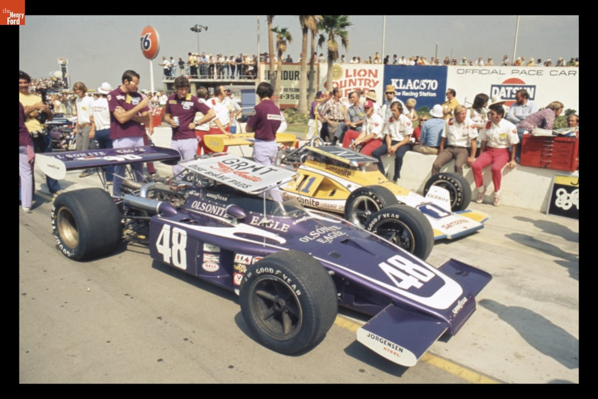 Eagle/Offy and Parnelli/Offy Race Cars at the California 500, Ontario, California, September 1972