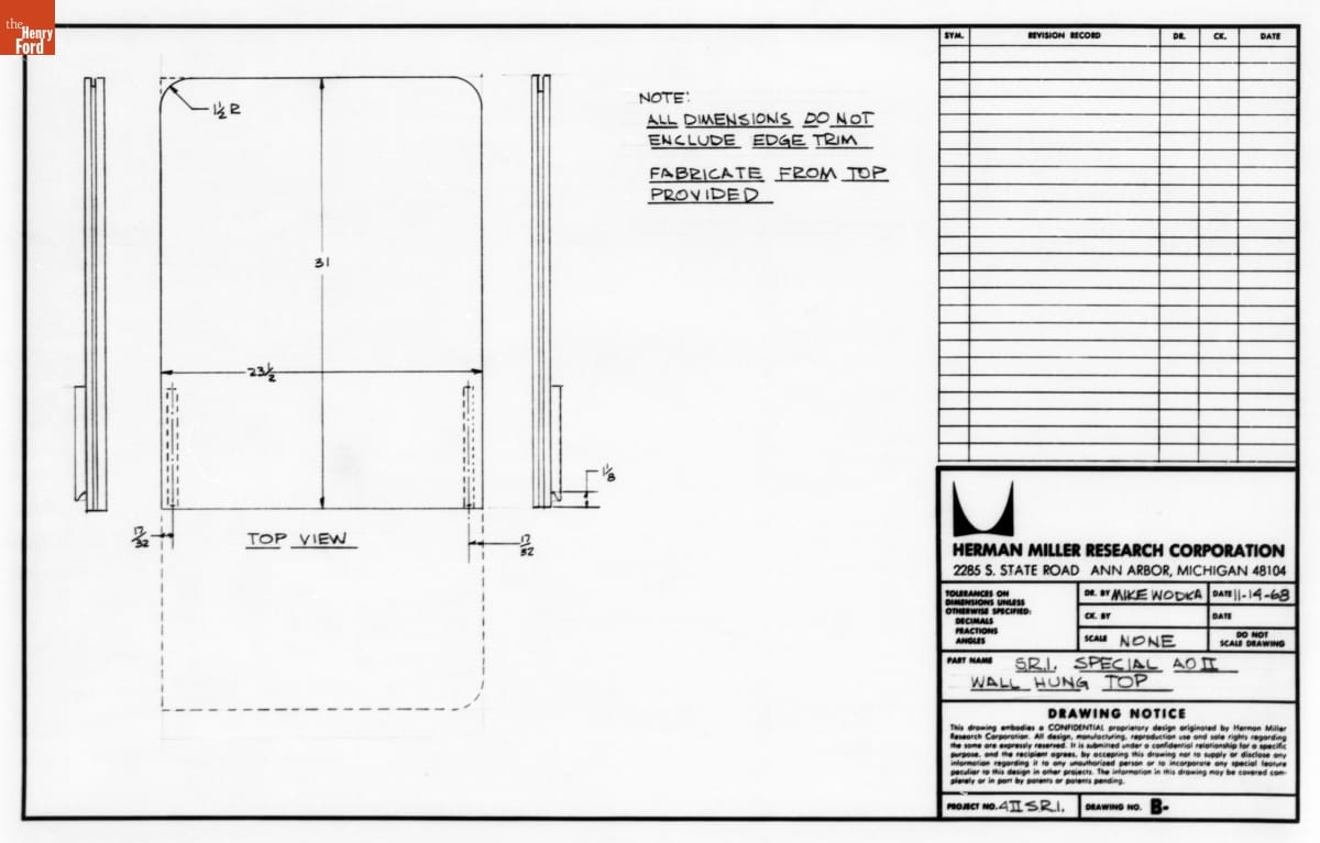 Technical Drawing, "Action Office System S.R.I. Special AOII Wall Hung Top," November 14, 1968