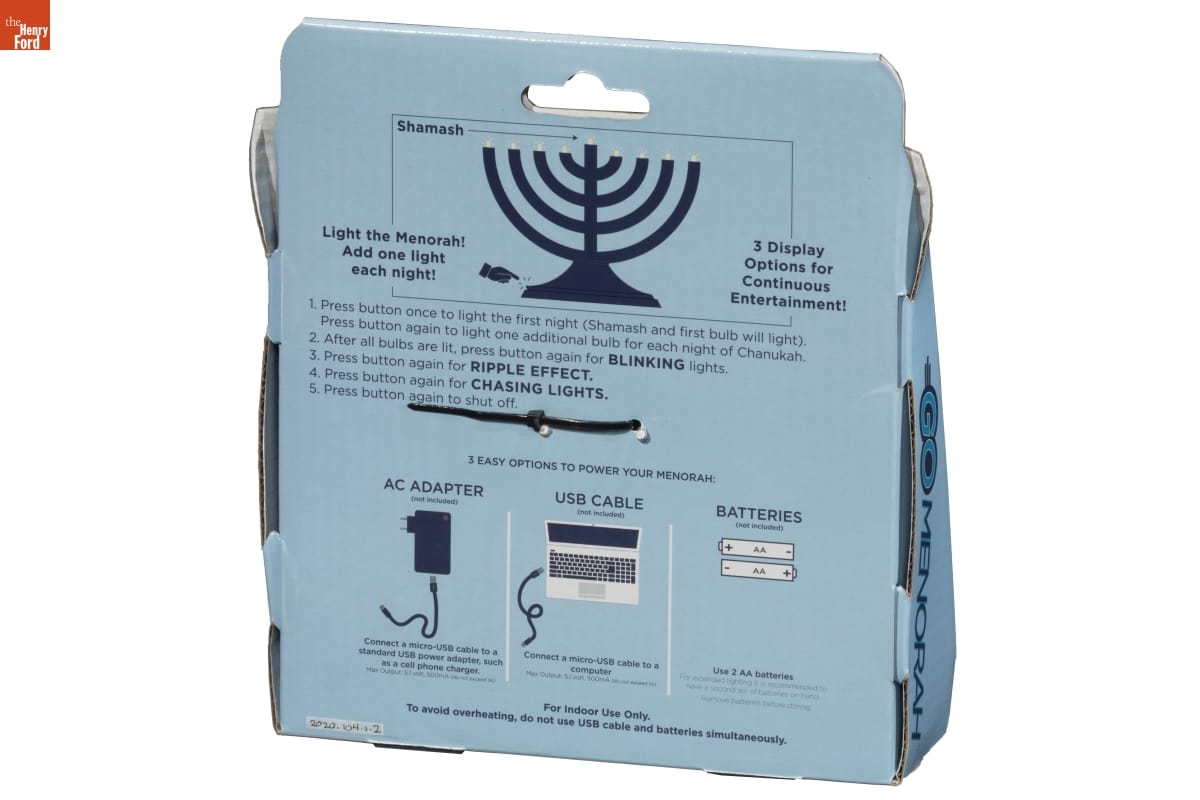 Shamash / Light the Menorah! / Add one light / each night! / 3 Display / Options for / Continuous / Entertainment! / 1. Press button once to light the first night (Shamash and first bulb will light). / Press button again to light one additional bulb for each night of Chanukah. / 2. After all ulbs are lit, press button again for BLINKING lights. / 3. Press button again for RIPPLE EFFECT. / 4. Press button again for CHASING LIGHTS. / 5. Press button again to shut off. / 3 EASY OPTIONS TO POWER YOUR MENORAH: / AC ADAPTER (not included) / Connect a micro-USB cable to a standard USB power adapter, such as a cell phone charger. Max Output: 5.1 volt, 500mA (do not exceed 1A) / USB CABLE (not included) / Connect a micro-USB cable to a computer. Max Output: 5.1 volt, 500mA (do not exceed 1A) / BATTERIES (not included) / Usse 2 AA batteries For extended lighting it is recommended to have a second set of batteries on hand. Remove batteries before storing. / For Indoor Use Only. / To avoid overheating, do not use USB cable and batteries simultaneously.