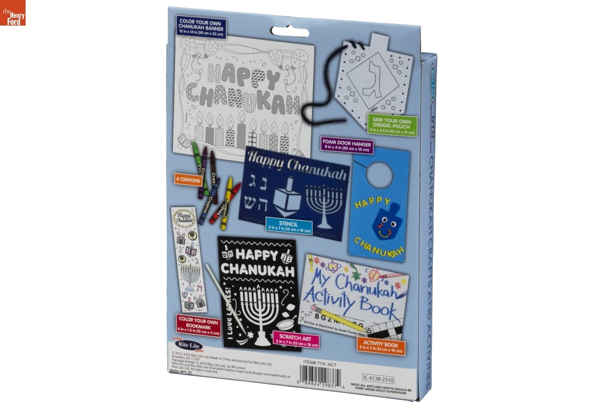 COLOR YOUR OWN CHANUKAH BANNER / 12 in x 14 in (30 cm x 35 cm) / SEW YOUR OWN DREIDEL POUCH / 4 in x 5.5 in (10 cm x 14 cm) / FOAM DOOR HANGER / 8 in x 4 in (20 cm x 10 cm) / 6 CRAYONS / STENCIL / 5 in x 7 in (13 cm x 18 cm) / COLOR YOUR OWN BOOKMARK / 6 in x 1.5 in (15 cm x 4 cm) / SCRATCH ART / 5 in x 7 in (13 cm x 18 cm) / ACTIVITY BOOK / 5 in x 7 in (13 cm x 18 cm) / www.Rite Lite.com / (C) 2012-2016 Rite Lite Ltd. Made in China exlusively for Rite Lite Ltd., / Brooklyn, NY 11207. / Package Design: (C) 2016 Rite Lite Ltd. by BR Leiner / Rite Lite and the Rite Lite Chanukah Express logos and designs are trademarks of / Rite Lite Ltd. / All rights reserved. / NOTE: ALL ARTS AND CRAFTS SHOULD BE / DONE UNDER ADULT SUPERVISION