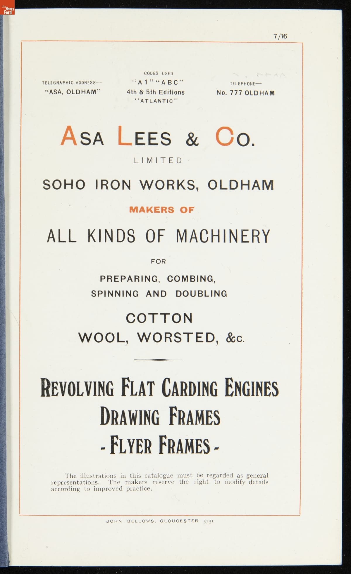 Asa Lees & Co. Trade Catalog, "Revolving Flat Carding Engines, Drawing Frames, Flyer Frames," 1916