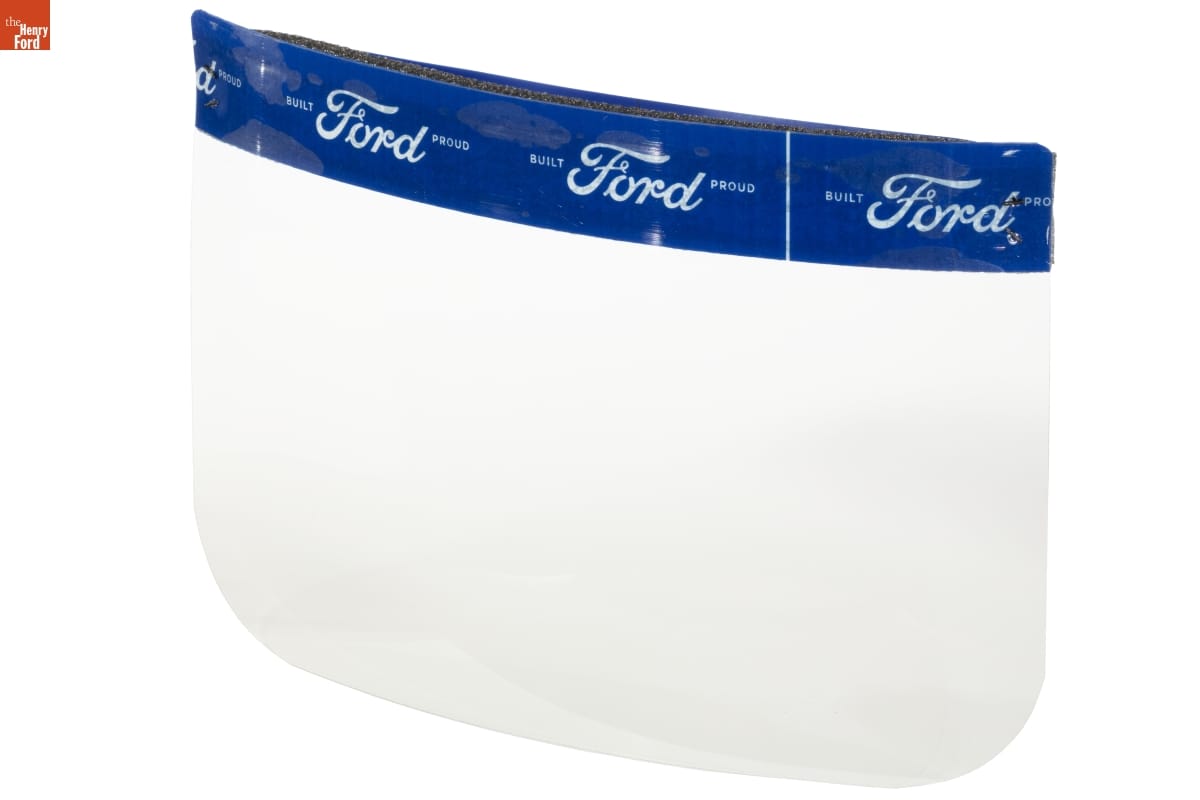 Like other American automakers, Ford Motor Company devoted employees and facilities to producing specialized equipment to fight the COVID-19 pandemic. This face shield reduced the risk of virus exposure through respiratory droplets. Unlike face masks, which impeded the spread of droplets from the wearer, face shields protected against the spread of droplets to the wearer.