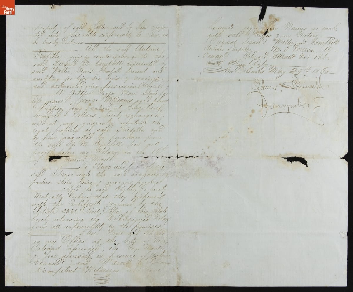 State of Louisiana__City of New Orleans__Be it known that on this twenty ninth day of May in the year of our Lord One Thousand eight hundred & sixty and of the independence of these United States of America the eighty fourth__Before me Edward Barnett, a notary public in and for the City & Parish of New Orleans, state of Louisiana [aforesaid] duly commissioned & sworn__Personally came and appeared Walter Louis Campbell of this City, attorney in fact of Bernard Moore Campbell of Baltimore, Maryland, [appointed] by power of attorney passed under private signature dated the 15th day of June 1850, the same day duly acknowledged before A. [G.] [Penington] a Justice of the Peace for the said State of Maryland & [unreadable] in the office of A. Barnett on the 26th day of same month & year of the [one] part__And Antoine Truxillo, of the parish of Assumption in this State of the other part__Which said appearers acting as aforesaid mutually declared that they do hereby make the following exchange of slaves [to rit];__The said Walter L. Campbell acting as aforesaid gives in exchange to the said Antoine Truxillo [present] [unreadable] his heirs & assigns & [unreadable] there of__A certain negro man slave named [Peter] [Dawkins] aged about twenty four [unreadable] valued at seventeen hundred dollars [unreadable] against the [unreadable] & [unreadable] prescribed by Law the legal property of said Seller and by him [unreadable] into this state [conformably] to Law, as he hereby declares__And the said Antoine Truxillo gives in counter exchange to the said Bernard M. Campbell represented by said Walter Lewis Campbell present and accepting for him his heirs & assigns and acknowledging [unreadable] there of__A certain negro man slave for life named George Williams aged about nineteen years valued at seventeen hundred dollars, hereby exchanged without any guarantee whatever the legal property of said Truxillo and by him acquired by purchase for the said B. M. Campbell [unreadable] act passed before me Notary on the 16th of this current month__To have and to hold the said slaves unto the said exchanging [unreadable] their heirs & assigns forever__And the said parties do hereby mutually declare that they [dispensed] with the certificate required by the article 3328 civil code of this State hereby releasing the undersigned Notary from all responsibility in the [premises]__Thus done and passed in my office at the City of New Orleans aforesaid the day, month & year aforesaid in presence of Antoine [unreadable] and Marcel [unreadable] competent witnesses who have hereinto sign their names as such, with said parties give Notary__Original signed Walter L. Campbell Antoine Truxillo__M.[T.] [Dueros] A Conand - Edward Barnett Not Pub: [unreadable]__New Orleans May 29th 1860__