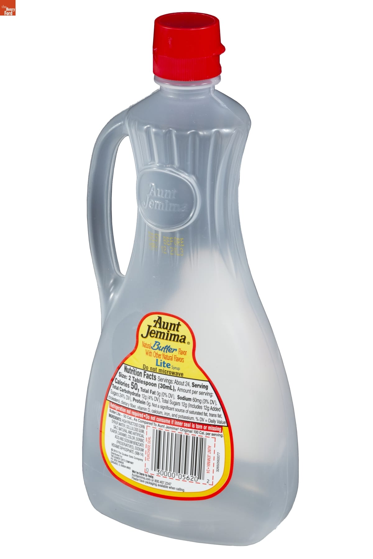 Aunt / Jemima / Natural Butter Flavor / With Other Natural Flavors / Lite Syrup / Do not microwave / Nutrition Facts [...] / Refrigeration not required Do not consume if inner seal is torn or missing. / Butter Lite - 50 Cal., As Compared To Aunt Jemima Original 100 Cal. per serving. / INGREDIENTS: [...] / (C) 2019 The Quaker Oats Company / Distributed by: / THE QUAKER OATS COMPANY / P.O. BOX 049003 / CHICAGO, IL 60604-9003 / We're here to help. / Auntjemima.com or 800.407.2247 / Please have packaging available when calling.