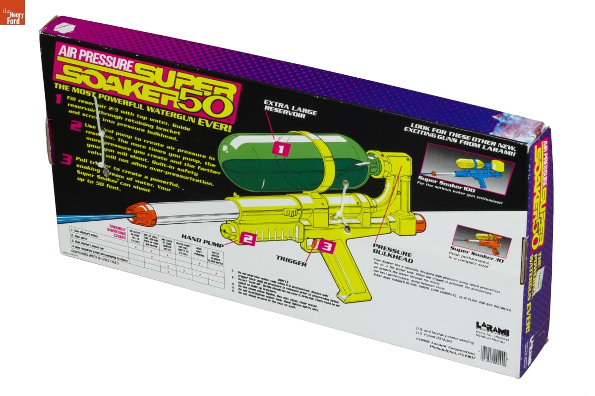 on side of water gun: AIR PRESSURE SUPER / SOAKER 50 / For Best Performance Pump Rapidly Between Shots / LARAMI / corp. / 1101 on front of packaging: AGES 5 AND UP / SAFE - POWERFUL / SHOOTS UP TO / 50 FEET / NO BATTERIES / REQUIRED / AIR PRESSURE SUPER / SOAKER 50 / THE MOST POWERFUL WATERGUN EVER! / Needs No Batteries / Quick-Pump Action / Extra Large Water Capacity / Safety Pressure Valve / 1 Fill reservoir half way with tap water. / 2 Use handpump to create air pressure in reservoir. / 3 Pull trigger to create a powerful stream of water. / LARAMI / corp. / Item No. 9929-0 / Made in Macau. on sides of packaging: AIR PRESSURE SUPER / SOAKER 50 / THE MOST / POWERFUL / WATERGUN EVER! / LARAMI / corp. / Item No. 9929-0 / Made in Macau. on back of packaging: AIR PRESSURE SUPER / SOAKER 50 / THE MOST POWERFUL WATERGUN EVER! / 1 Fill reservoir 2/3 with tap water. Guide reservoir through retaining bracket and screw into pressure bulkhead. / 2 Use hand pump to create air pressure in reservoir. The more times you pump, the more pressure you create and the farther your gun will shoot. Built-in safety valve will not allow over-pressurization. / 3 Pull trigger to create a powerful stream of water. Your Super Soaker can shoot up to 50 feet. / LOOK FOR THESE OTHER NEW, / EXCITING GUNS FROM LARAMIE! / Super Soaker 100 / For the serious water gun enthusiast! / Super Soaker 30 / Peak Performance / in a compact size! / PRESSURE / BULKHEAD / Your soaker has a specially designed high pressure pump which pressurizes the air in the water tank. When the trigger is pressed, the pressurized air propels the water through the nozzle. / For best performance, pump between shots. / MAKE SURE WASHER IN GUN, WHERE TANK CONNECTS, IS IN PLACE AND NOT DISTORTED. / LARAMI / corp. / Item No. 9929-0 / Made in Macau. / CONFORMS WITH 15 CFR S 1150.3 / U.S. and foreign patents pending / U.S. Patent D318,309 / (C) 1990 Larami Corporation / Philadelphia, PA 19107