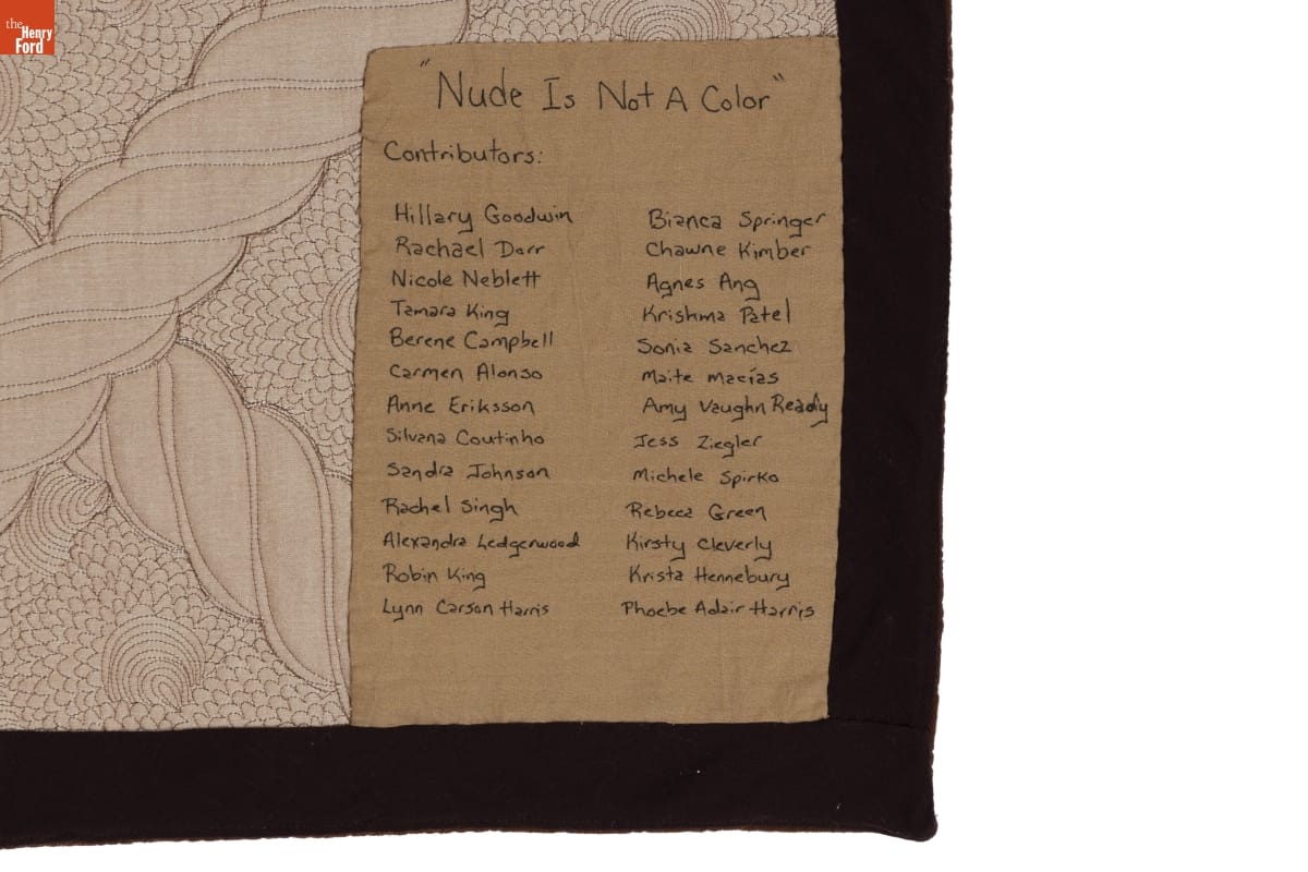 Fashion and cosmetics companies have long used the term nude for products made in a pale beige--reflecting lighter skin tones and marginalizing people of color. After one company repeatedly dismissed a customer's concerns, a global community of quilters produced this quilt to oppose this racial bias. To create the shirt designs, the women chose fabric that best represented their own skin tones.