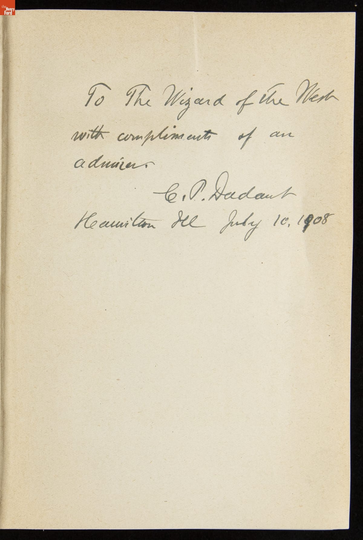 on front flyleaf: To the Wizard of the West with compliments of an admirer. C. A. Dadant, Hamilton, Ill, July 10, 1908.