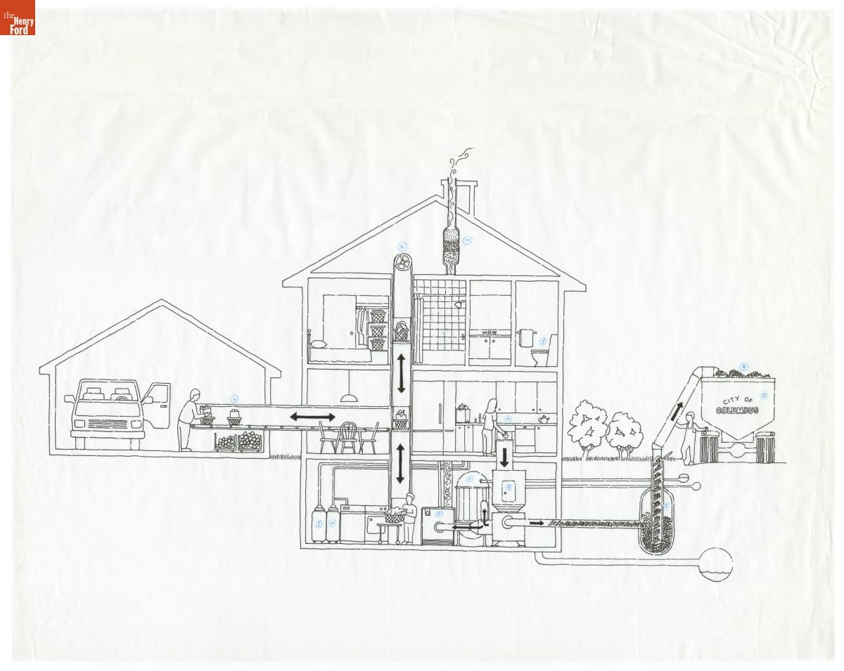 Drawing of the "Metabolic House" Concept by Bill Stumpf, circa 1989