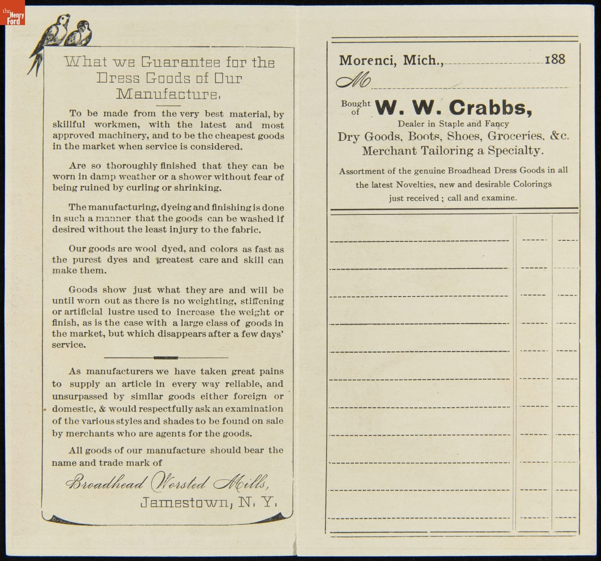 Manufactured by Broadhead Worsted Mills, Jamestown, New York. Retailed by W.W. Crabbs, Morenci, Michigan. Lithographed by Donaldson Brothers, Five Points, New York.
