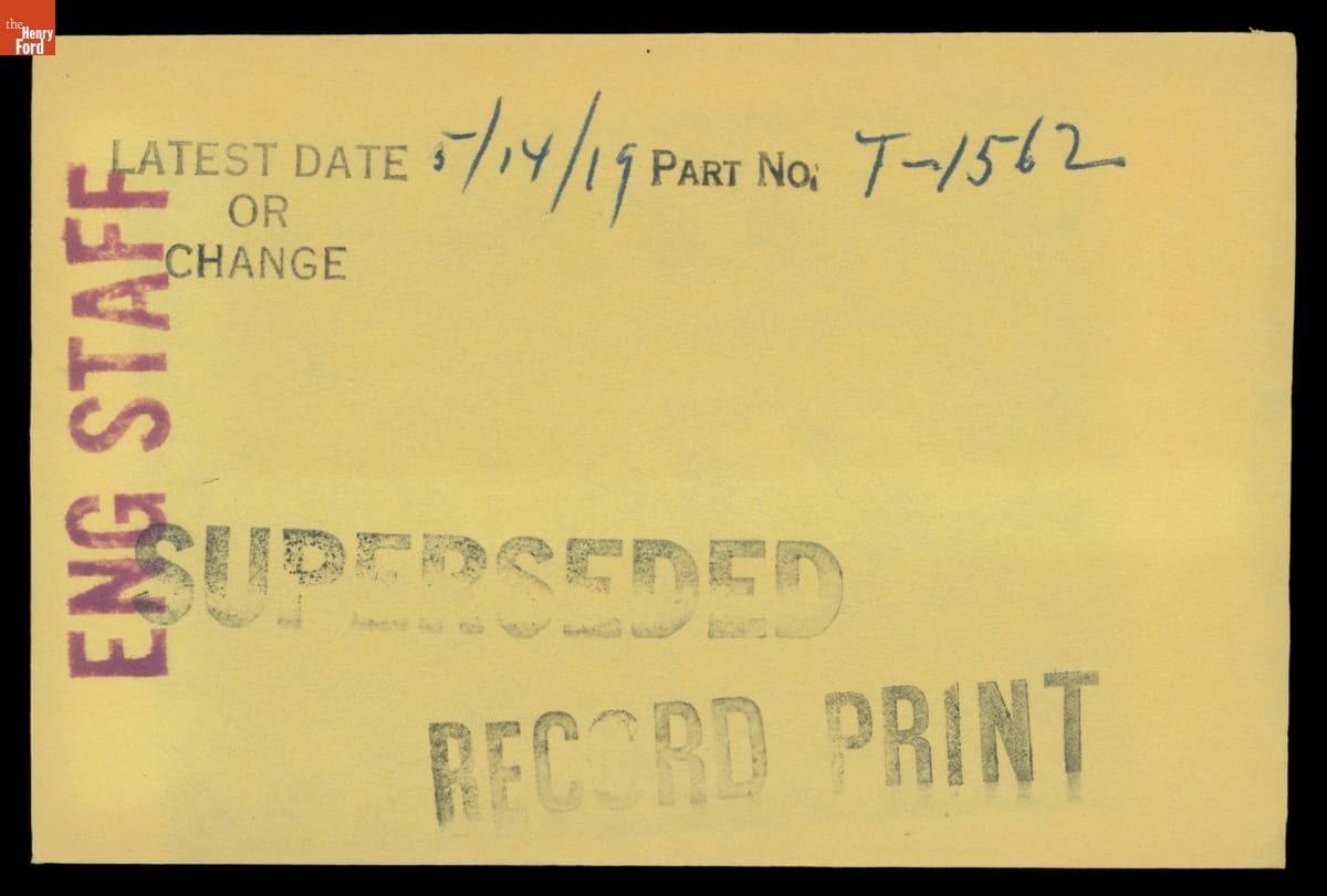 The Ford Motor Company created over a million parts drawings from 1903 to 1957. Many of these drawings specify engineering requirements for the components of Ford-made vehicles--including automobiles, trucks, tractors, military vehicles and Tri-motor airplanes. Others document assembly components, stages of casting and forging, or experimental designs. Beginning in the 1940s, Ford transferred the drawings to microfilm.