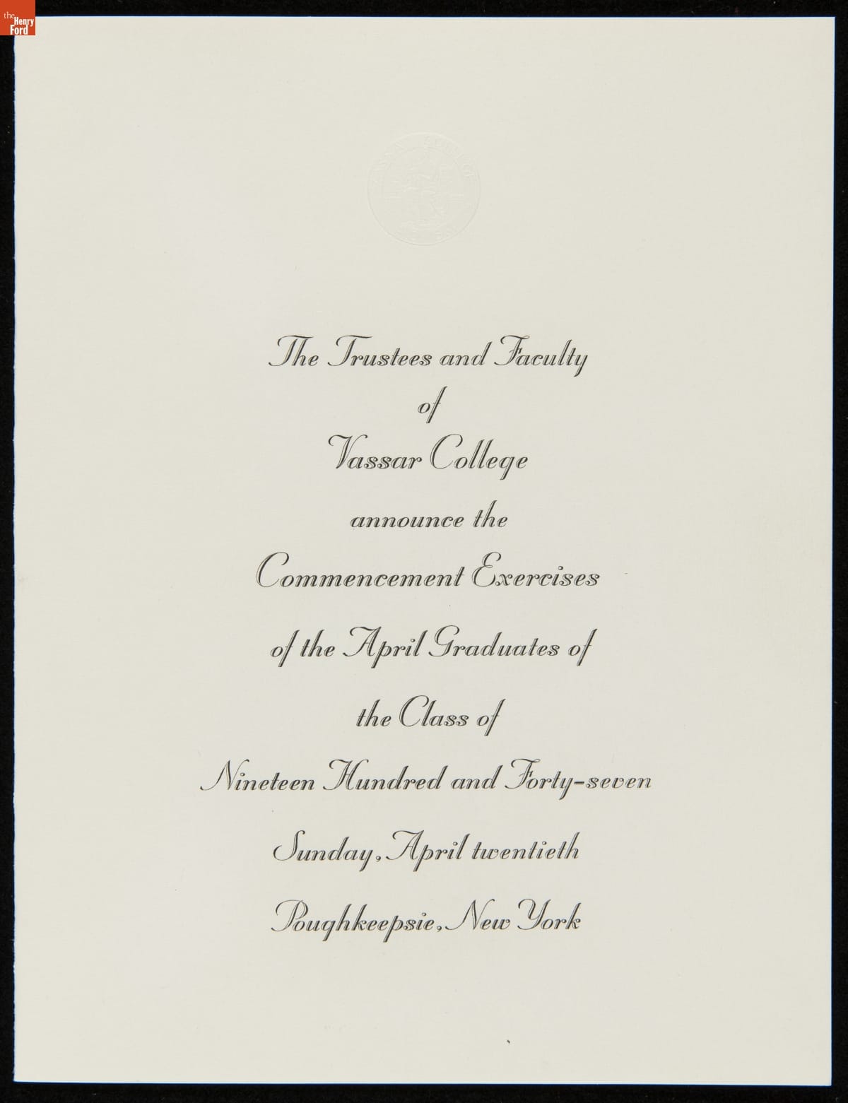 Invitation to Commencement Exercises at Vassar, Sent by Martha Parke Firestone to Her Parents, April 1947