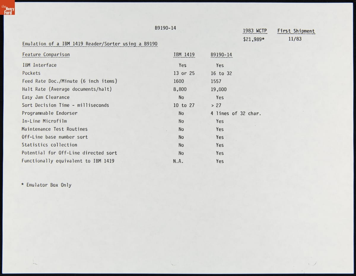 Specifications for the Burroughs B9190-14 Document Processor, September 1983