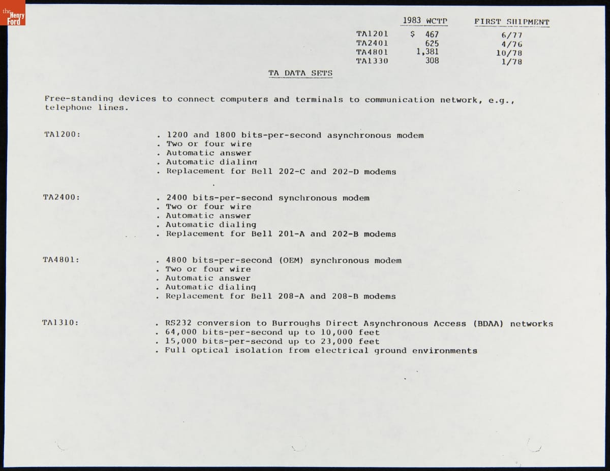 Specifications for the Burroughs TA4800 Data Sets, September 1983