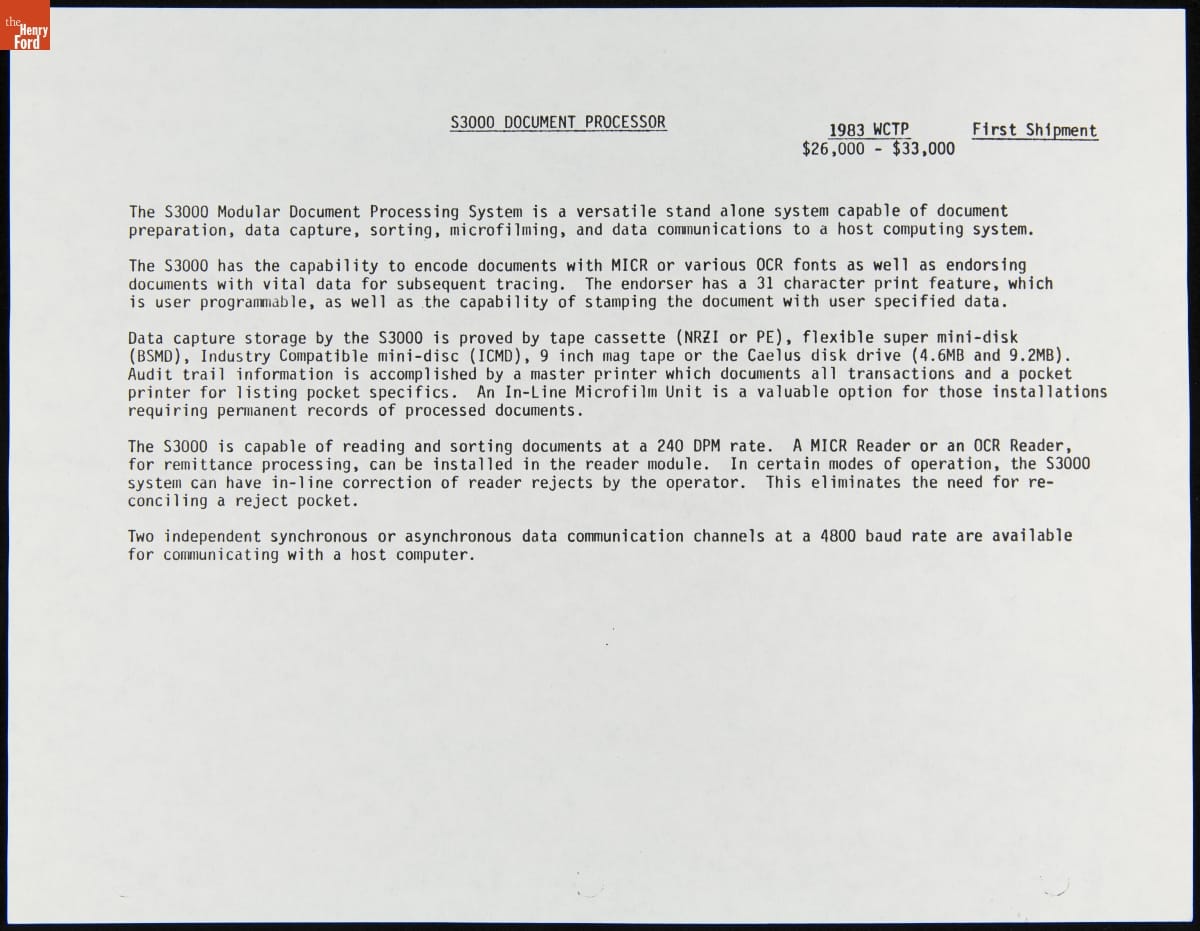 Specifications for the Burroughs S3000 Document Processor, September 1983