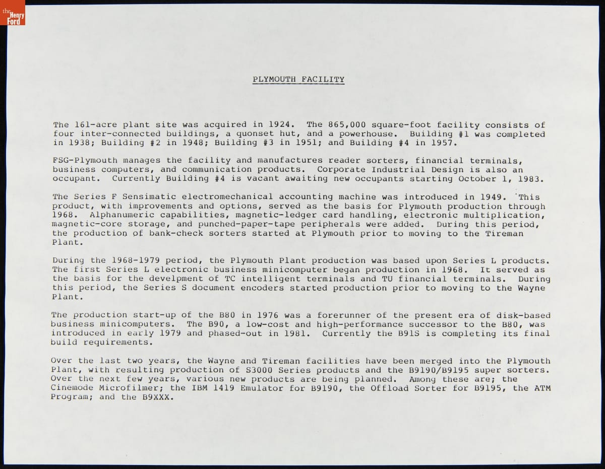 Burroughs Plymouth Plant Facility History, September 1983