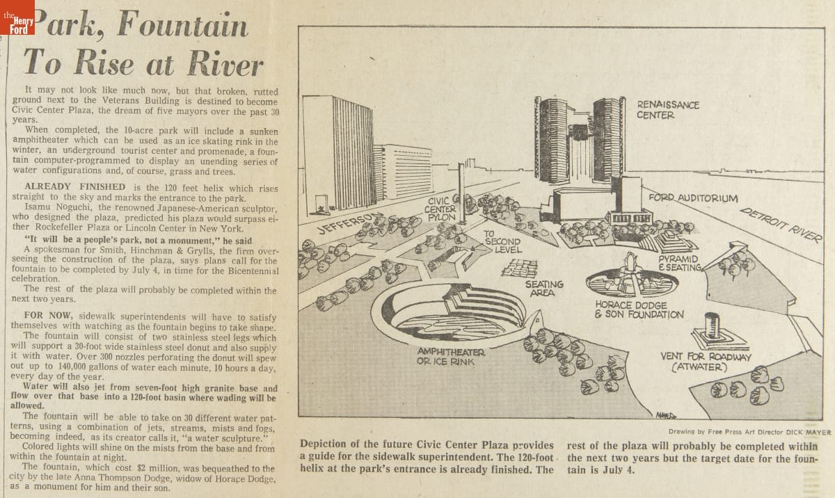 Detroit Free Press Article, "Park, Fountain To Rise at River," March 16, 1976
