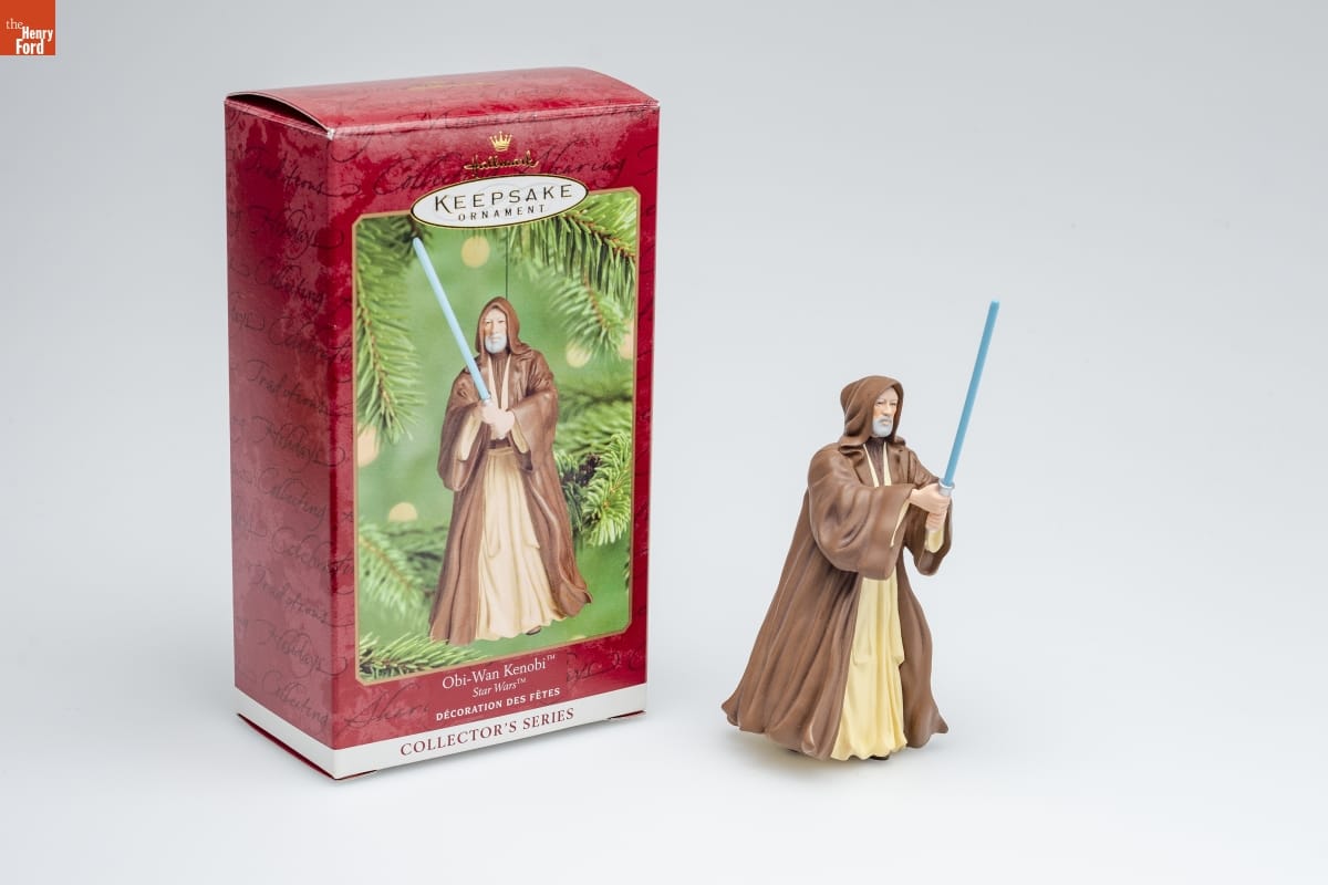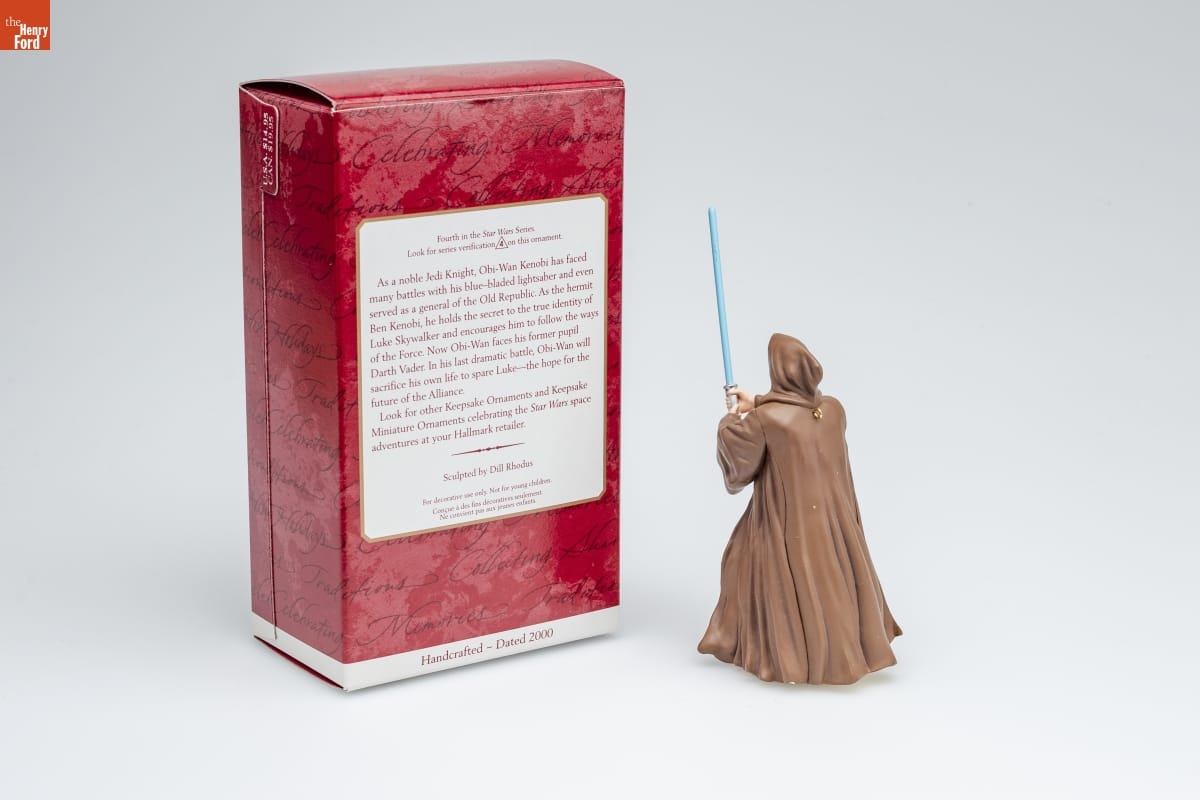 Fourth in the Star Wars Series. / Look for series verification 4 on this ornament. / As a noble Jedi Knight, Obi-Wan Kenobi has faced / many battles with his blue-bladed lightsaber and even / served as a general of the Old Republic. As the hermit / Ben Kenobi, he holds the secret to the true identity of / Luke Skywalker and encourages him to follow the ways / of the Force. Now Obi-Wan faces his former pupil / Darth Vader. In his last dramatic battle, Obi-Wan will sacrifice his own life to spare Luke --the hope for the / future of the Alliance. / Look for other Keepsake Ornaments and Keepsake / Miniature Ornaments celebrating the Star Wars space / adventures at your Hallmark retailer. / Sculpted by Dill Rhodus / For decorative use only. Not for young children. / Concue a des fins decoratives seulement. / Ne convient pas aux jeaunes enfants. / Handcrafted - Dated 2000