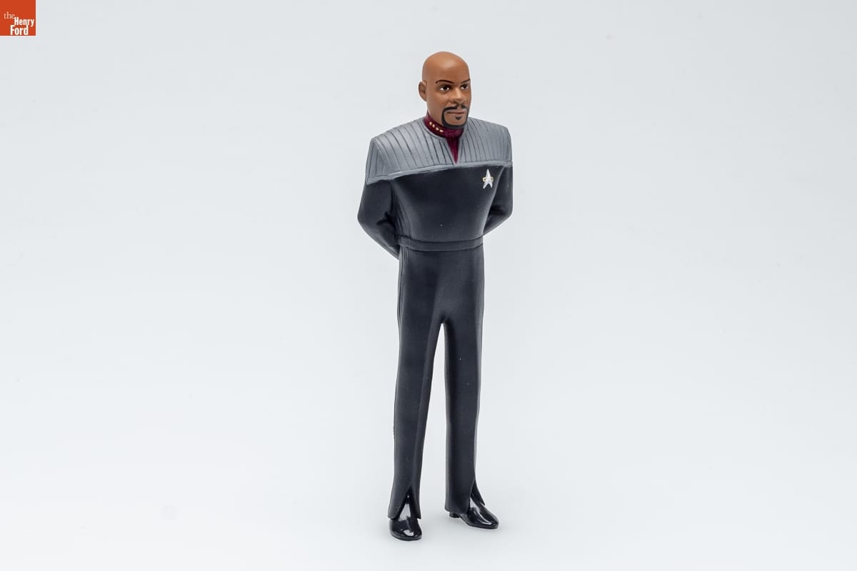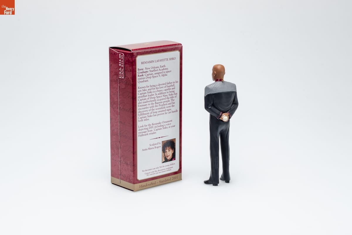 BENJAMIN LAFAYETTE SISKO / Born: New Orleans, Earth. / Graduate: Starfleet Academy. / Rank: Captain, assigned to space / station Deep Space 9, Alpha / Quadrant. / Known for being a devoted father to his / son Jake, and for his love of baseball / Captain Sisko is a brave, capable and / steadfast leader. In addition to being / Captain of Deep Space Nine, Sisko has / also inadvertently acquired the title of / Emissary to the Bajoran people. The / encounter with the Prophets and his / discovery of the wormhole were the / fulfillment of long-awaited signs. / Captain Sisko has proven he can handle / both titles. / Look for the Keepsake Ornament / depicting DS9, including a voice / message from Captain Sisko, at your / Hallmark retailer. / Sculpted by / Anita Marra Rogers / For decorative use only. Not for young children. / Concue a des fins decoratives seulement. / Ne convient pas aux jeaunes enfants. / Handcrafted - Stardated 2001