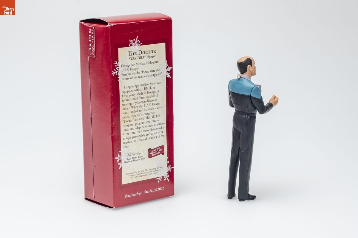 THE DOCTOR / STAR TREK: Voyager / Emergency Medical Hologram, / U.S.S. Voyager / Famous words: "Please state the / nature of the medical emergency." / Long-range Starfleet vessels are / equipped with an EMH, or / Emergency Medical Hologram / in humanoid form, capable of / treating any known disease or / injury. When the U.S.S. Voyager / was stranded and its medical crew / killed, the ship's emergency / "Doctor" answered the call. His / computer program ran continu- / ously and adapted to new situations. / Over time, the Doctor developed a / unique personality and came to be / regarded as a valued member of the / crew. / CHRISTMAS / MEMORY CARD / ENCLOSED / Anita Marra Rogers / Hallmark Keepsake Artist / For decorative use only. Not for young children. / Concue a des fins decoratives seulement. / Ne convient pas aux jeunes enfants. / Handcrafted - Stardated 2002