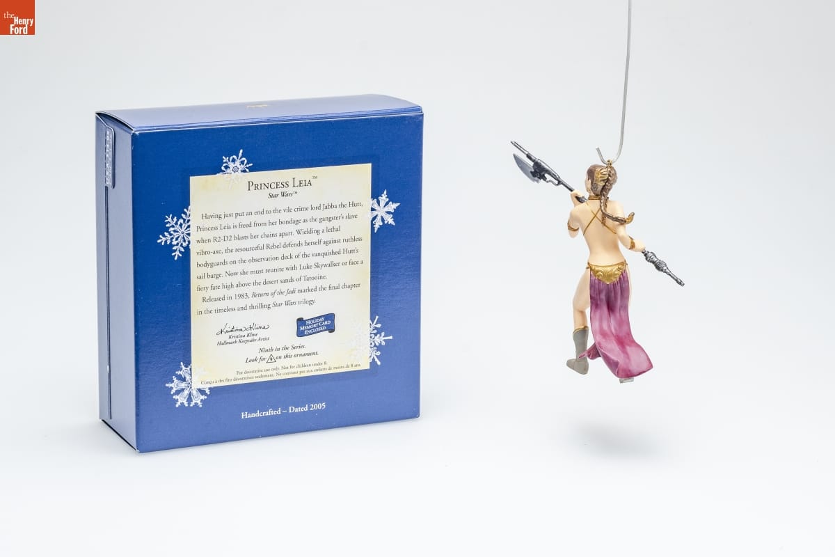 PRINCESS LEIA / Star Wars / Having just put an end to the vile crime lord Jabba the Hutt, / Princess Leia is freed from her bondage as the gangster's slave / when R2-D2 blasts her chains apart. Wielding a lethal / vibro-axe, the resourceful Rebel defends herself against ruthless / bodyguards on the observation deck of the vanquished Hutt's / sail barge. Now she must reunite with Luke Skywalker or face a / fiery fate high above the desert sands of Tatooine. / Released in 1983, Return of the Jedi marked the final chapter / in the timeless and thrilling Star Wars trilogy. / HOLIDAY / MEMORY CARD / ENCLOSED / Kristina Kline / Hallmark Keepsake Artist / Ninth in the Series. / Look for 9 on this ornament. / For decorative use only. Not for children under 8. / Concue a des fins decoratives seulement. Ne convient pas aux enfants de moins de 8 ans. / Handcrafted - Dated 2005