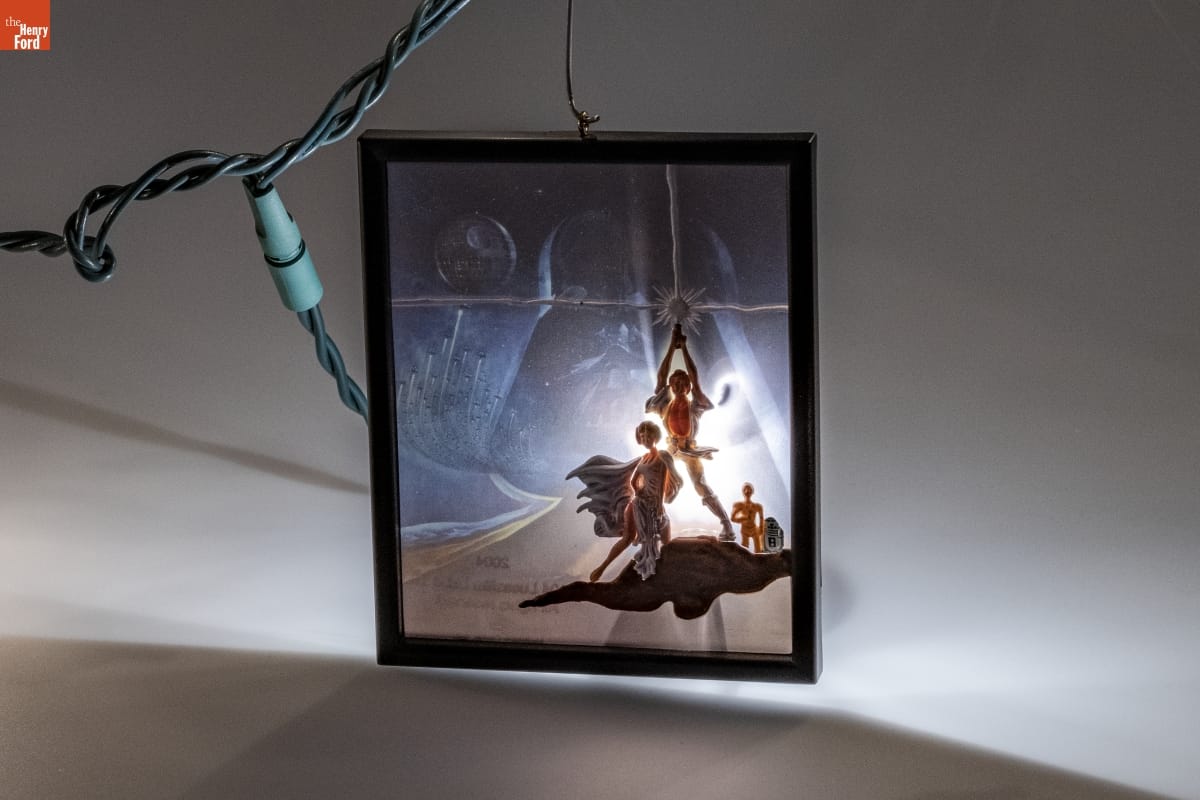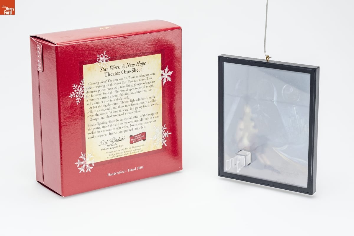 Star Wars: A New Hope / Theater One-Sheet / Coming Soon! The year was 1977 and moviegoers were / eagerly waiting for their first Star Wars adventure. This / dramatic poster provided a tantalizing glimpse of a galaxy / far, far away. Soon the film would open to reveal an epic / adventure starring a beautiful princess, a brave warrior, / and a sinister man in a black mask... / At last the big day came. Theater lights dimmed, music / built to a crescendo, and those now famous words scrolled / across the screen: "A long time ago in a galaxy far, far away..." / George Lucas had produced a masterpiece. / Special lighting effect: To see the full effect of the image on / the poster, attach the clip on the ornament directly to a lamp / socket on a miniature light string. No separate connector / cord is required. Instructions printed inside box. / HOLIDAY / MEMORY CARD / ENCLOSED / Dill Rhodus / Hallmark Keepsake Artist / For decorative use only. Not for children under 8. / Concue a des fins decoratives seulement. / Ne convient pas aux enfants de moins de 8 ans. / Handcrafted - Dated 2004
