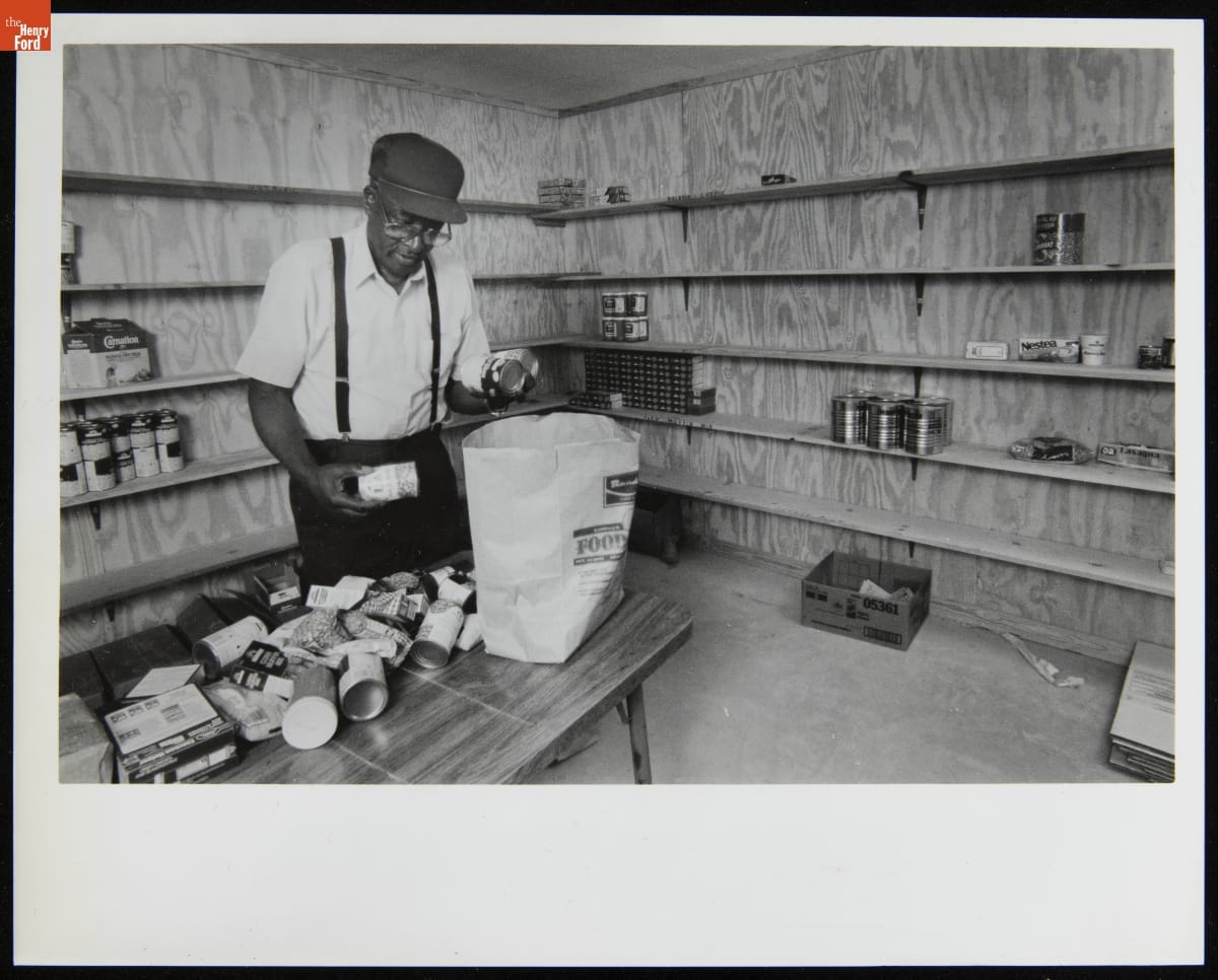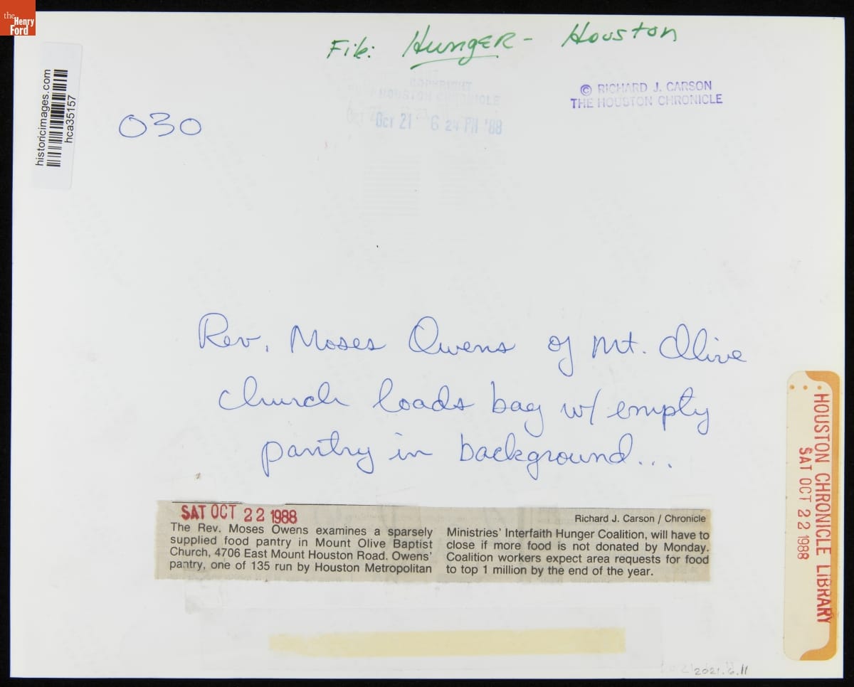 The Reverend Moses Owens of Mt. Olive Church Loads a Bag with Donated Food, October 1988