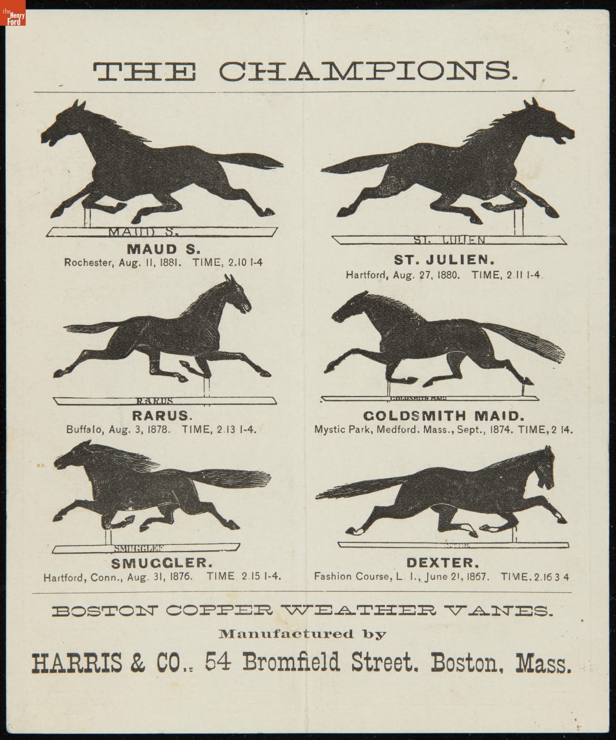 Harris & Company manufactured copper weathervanes. Among this Boston, Massachusetts, firm's offerings were weathervane ornaments representing well-known racehorses. Customers could choose from six champions depicted in this catalog from the mid-1880s.