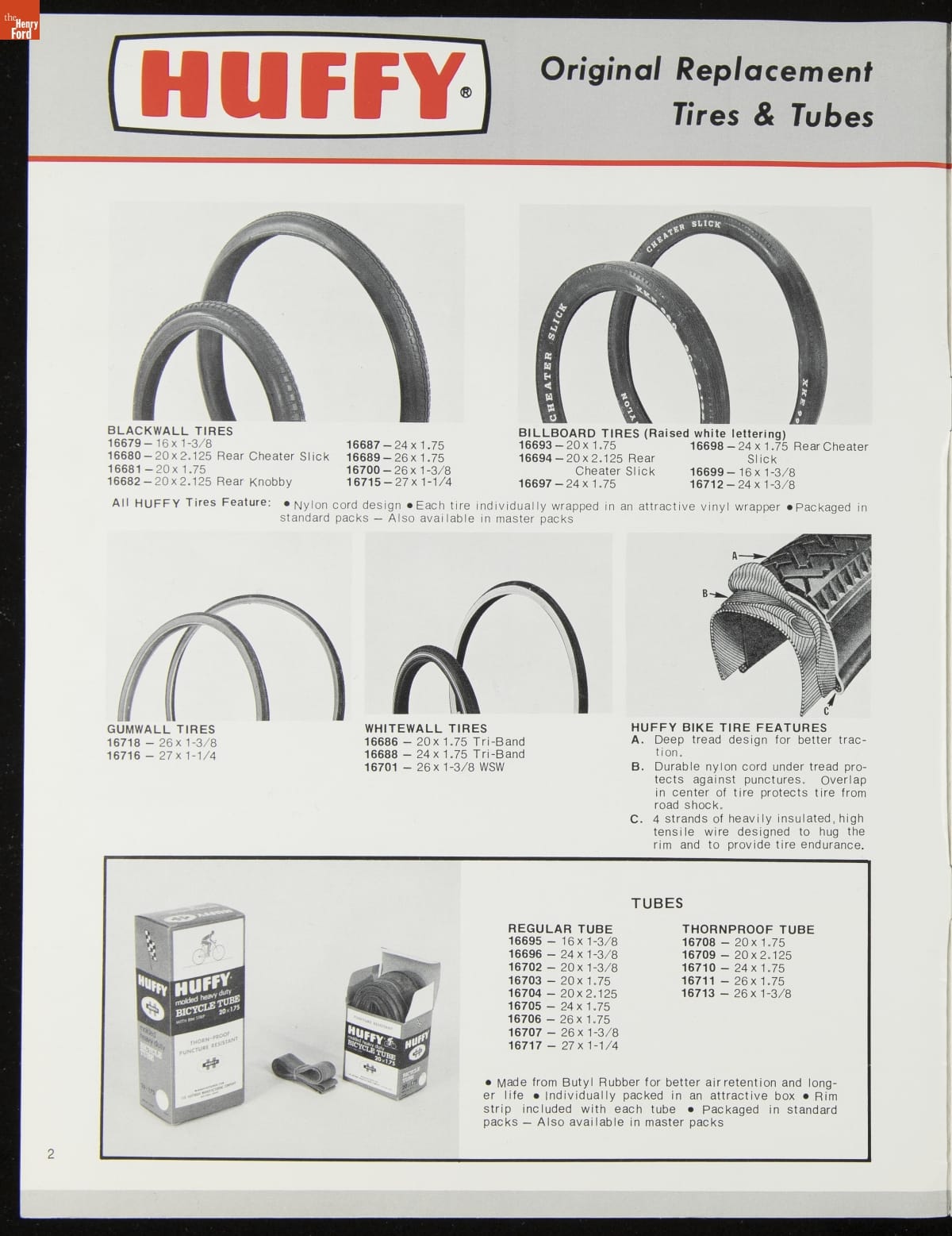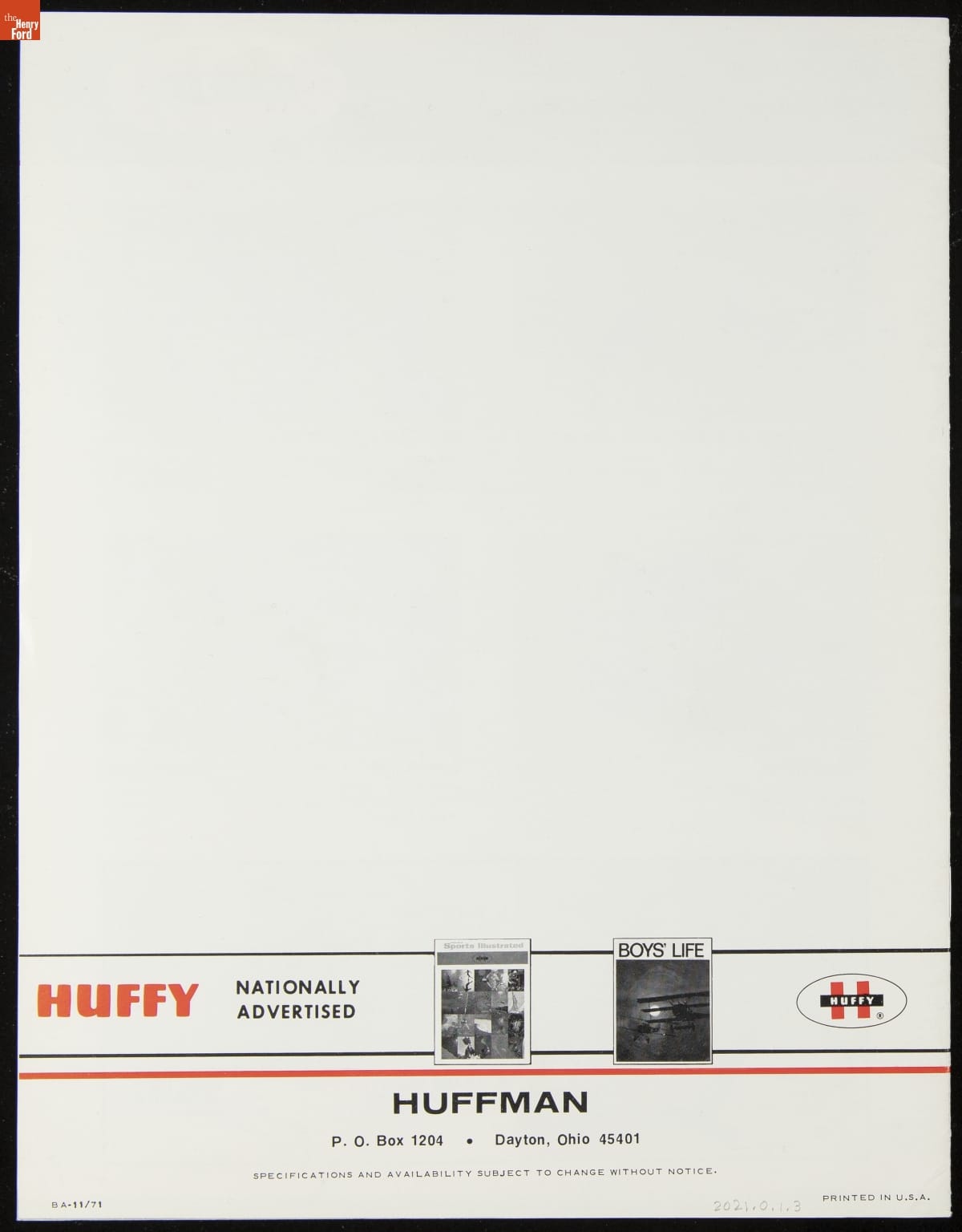 Huffy Corporation traces its roots to 1892 in its hometown of Dayton, Ohio. Though it participated in the bicycle craze of the 1890s, Huffy is better known for the entry-level bikes it built for baby boomers and Gen Xers in the 20th century. This 1972 Huffy accessories catalog included everything from tires to kickstands to handlebar baskets.