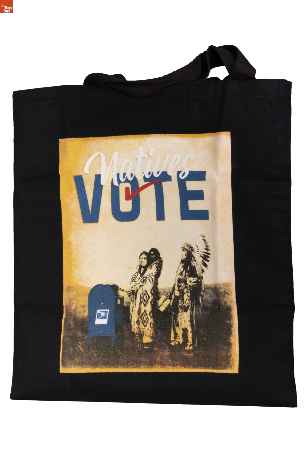 This bag was created to drive participation of Native American voting in the 2020 US Presidential election. It depicts a family dressed in regalia, placing ballots into a USPS mailbox, wearing COVID-19 facemasks. Created by artist Steven Paul Judd (Kiowa-Choctaw), it was produced in partnership with the Illuminatives organization and distributed through Native-owned fashion business, B.Yellowtail (Northern Cheyenne / Crow).