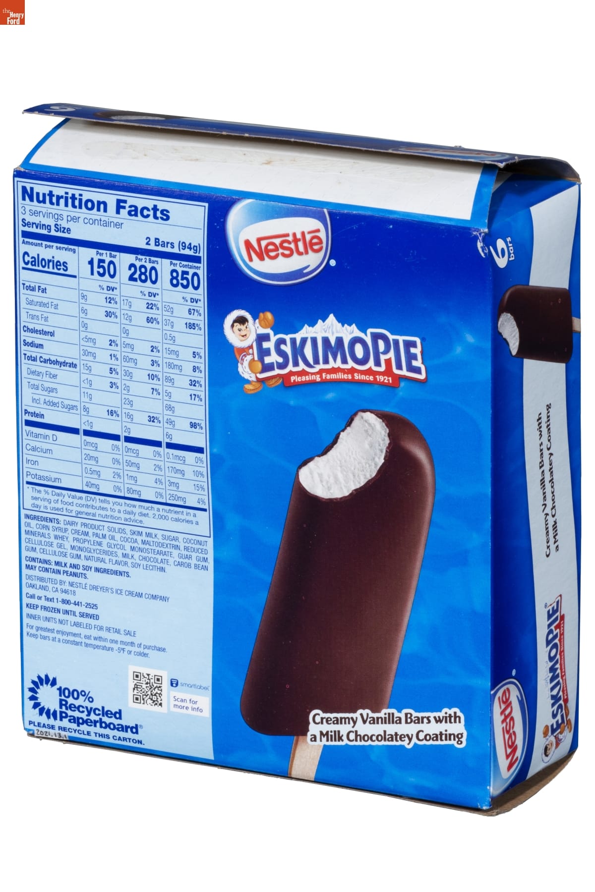 Nestle / ESKIMOPIE / Pleasing Families Since 1921 / Creamy Vanilla Bars with / a Milk Chocolatey Coating / DISTRIBUTED BY NESTLE DREYER'S ICE CREAM COMPANY / OAKLAND, CA 94618 / Call or Text 1-800-441-2525 / KEEP FROZEN UNTIL SERVED / [...] / smartlabel / Scan for / more info / 100% / Recycled / Paperboard / PLEASE RECYCLE THIS CARTON.