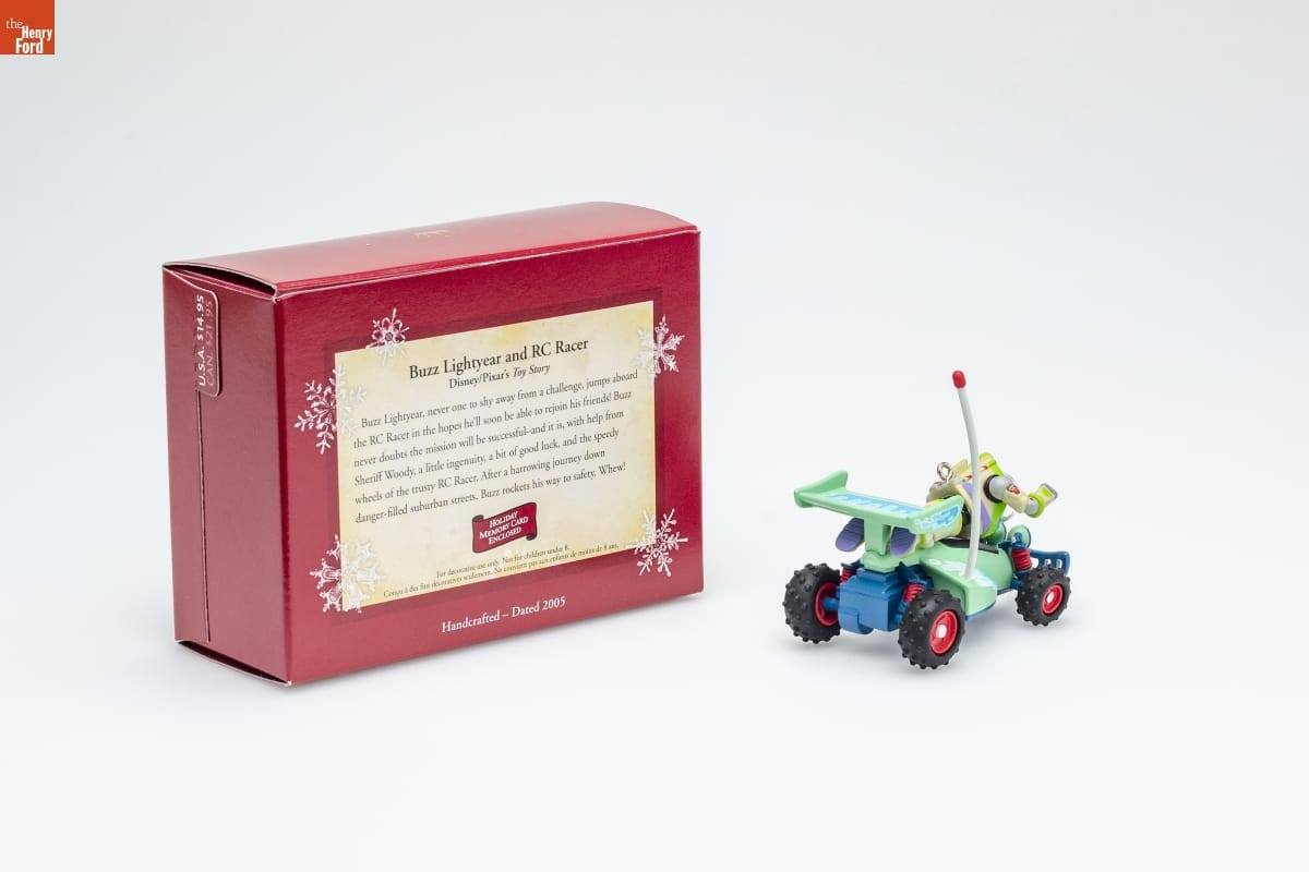 Buzz Lightyear and RC Racer / Disney/Pixar's Toy Story / Buzz Lightyear, never one to shy away from a challenge, jumps aboard / the RC Racer in the hopes he'll soon be able to rejoin his friends! Buzz / never doubts the mission will be successful--and it is, with help from / Sheriff Woody, a little ingenuity, a bit of good luck, and the speedy / wheels of the trusy RC Racer. After a harrowing journey down / danger-filled suburban streets, Buzz rockets his way to safety. Whew! / HOLIDAY / MEMORY CARD / ENCLOSED / For decorative use only. Not for children under 8. / Concue a des fins decoratives seulement. Ne convient pas aux enfants de moins de 8 ans. / Handcrafted - Dated 2005