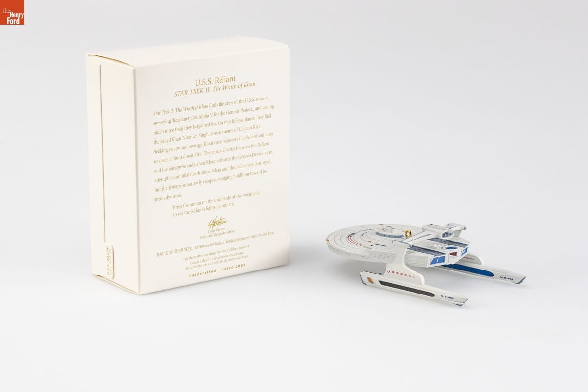 U.S.S. Reliant / STAR TREK II: The Wrath of Khan / Star Trek II: The Wrath of Khan finds the crew of the U.S.S. Reliant / surveying the planet Ceti Alpha V for the Genesis Project...and getting / much more than they bargained for. On that lifeless planet, they find / the exiled Khan Noonien Singh, sworn enemy of Captain Kirk. / Seeking escape and revenge, Khan commandeers the Reliant and takes / to space to hunt down Kirk. The ensuing battle between the Reliant / and the Enterprise ends when Khan activates the Genesis Device in an / attempt to annihilate both ships. Khan and the Reliant are destroyed, / but the Enterprise narrowly escapes, voyaging boldly on toward its / next adventure. / Press the button on the underside of the ornament / to see the Reliant's lights illuminate. / Lynn Norton / Hallmark Keepsake Artist / BATTERY-OPERATED. Batteries included. Instructions printed inside box. / For decorative use only. Not for children under 8. / Concue a des fins decoratives seulement. / Ne convient pas aux enfants de moins de 8 ans. / handcrafted - dated 2008