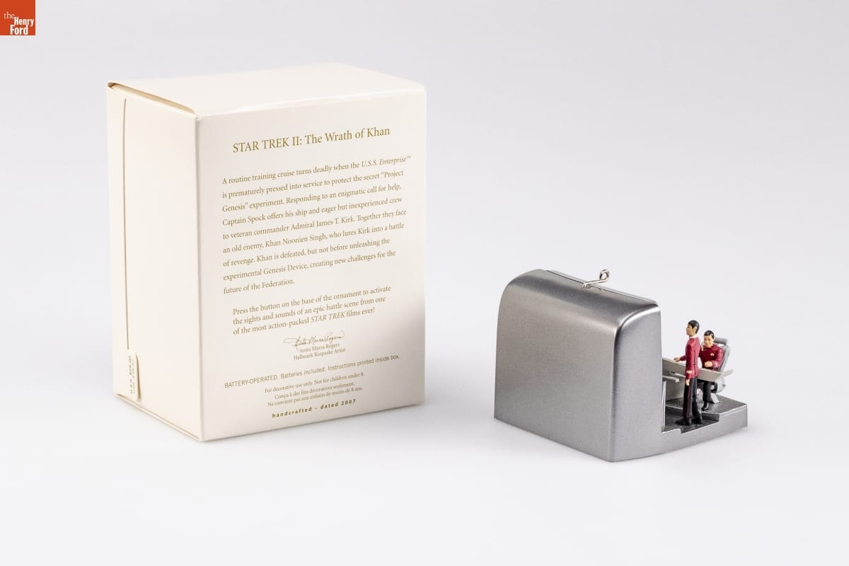 STAR TREK II: The Wrath of Khan / A routine training cruise turns deadly when the U.S.S. Enterprise / is prematurely pressed into service to protect the secret "Project / Genesis" experiment. Responding to an enigmatic call for help, / Captain Spock offers his ship and eager but inexperienced crew / to veteran commander Admiral James T. Kirk. Together they face / an old enemy, Khan Noonien Singh, who lures Kirk into a battle / of revenge. Khan is defeated, but not before unleashing the / experimental Genesis Device, creating new challenges for the / future of the Federation. / Press the button on the base of the ornament to activate / the sights and sounds of an epic battle scene from one / of the most action-packed STAR TREK films ever! / Anita Marra Rogers / Hallmark Keepsake Artist / BATTERY-OPERATED. Batteries included. Instructions printed inside box. / For decorative use only. Not for children under 8. / Concue a des fins decoratives seulement. / Ne convient pas aux enfants de moins de 8 ans. / handcrafted - dated 2007