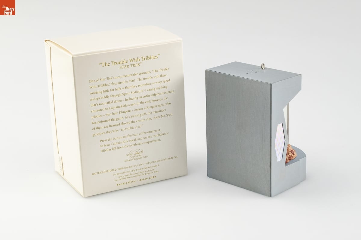 "The Trouble With Tribbles" / STAR TREK / One of Star Trek's most memorable episodes, "The Trouble / With Tribbles," first aired in 1967. The trouble with these / soothing little fur balls is that they reproduce at warp speed / and go boldly through Space Station K-7 eating anything / that's not nailed down - including an entire shipment of grain / entrusted to Captain Kirk's care! In the end, however, the / tribbles - who hate Klingons - expose a Klingon agent who / has poisoned the grain. As a parting gift, the remainder / of them are beamed aboard the enemy ship, where Mr. Scott / promises they'll be "no trouble at all." / Press the button on the base of the ornament / to hear Captain Kirk speak and see the troublesome / tribbles fall from the overhead compartment. / Don Palmiter / Hallmark Keepsake Artist / BATTERY-OPERATED. Batteries included. Instructions printed inside box. / For decorative use only. Not for children under 8. / Concue a des fins decoratives seulement. / Ne convient pas aux enfants de moins de 8 ans. / handcrafted - dated 2008