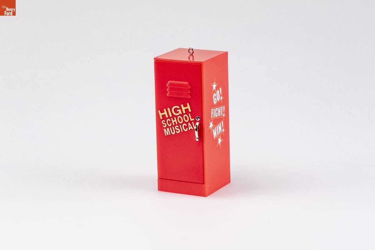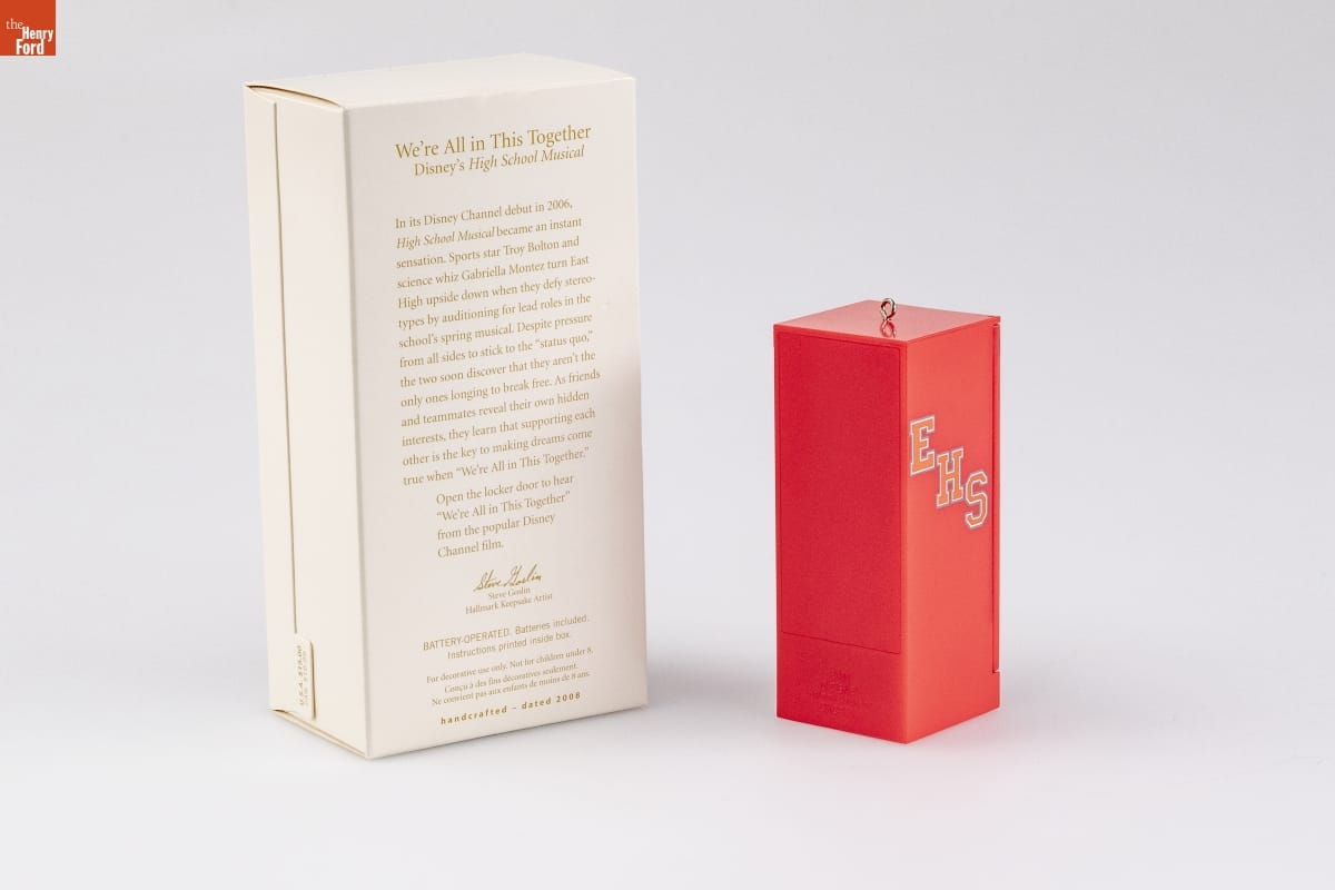We're All in This Together / Disney's High School Musical / In its Disney Channel debut in 2006, / High School Musical became an instant / sensation. Sports star Troy Bolton and / science whiz Gabriella Montez turn East / High upside down when they defy stereo- / types by auditioning for lead roles in the / school's spring musical. Despite pressure / from all sides to stick to the "status quo," / the two soon discover that they aren't the / only ones longing to break free. As friends / and teammates reveal their own hidden interests, they learn that supporting each / other is the key to making dreams come / true when "We're All in This Together." / Open the locker door to hear / "We're All in This Together" / from the popular Disney / Channel film. / Steve Goslin / Hallmark Keepsake Artist / BATTERY-OPERATED. Batteries included. / Instructions printed inside box. / For decorative use only. Not for children under 8 / Concue a des fins decoratives seulement. / Ne convient pas aux enfants de moins de 8 ans. / handcrafted - dated 2008