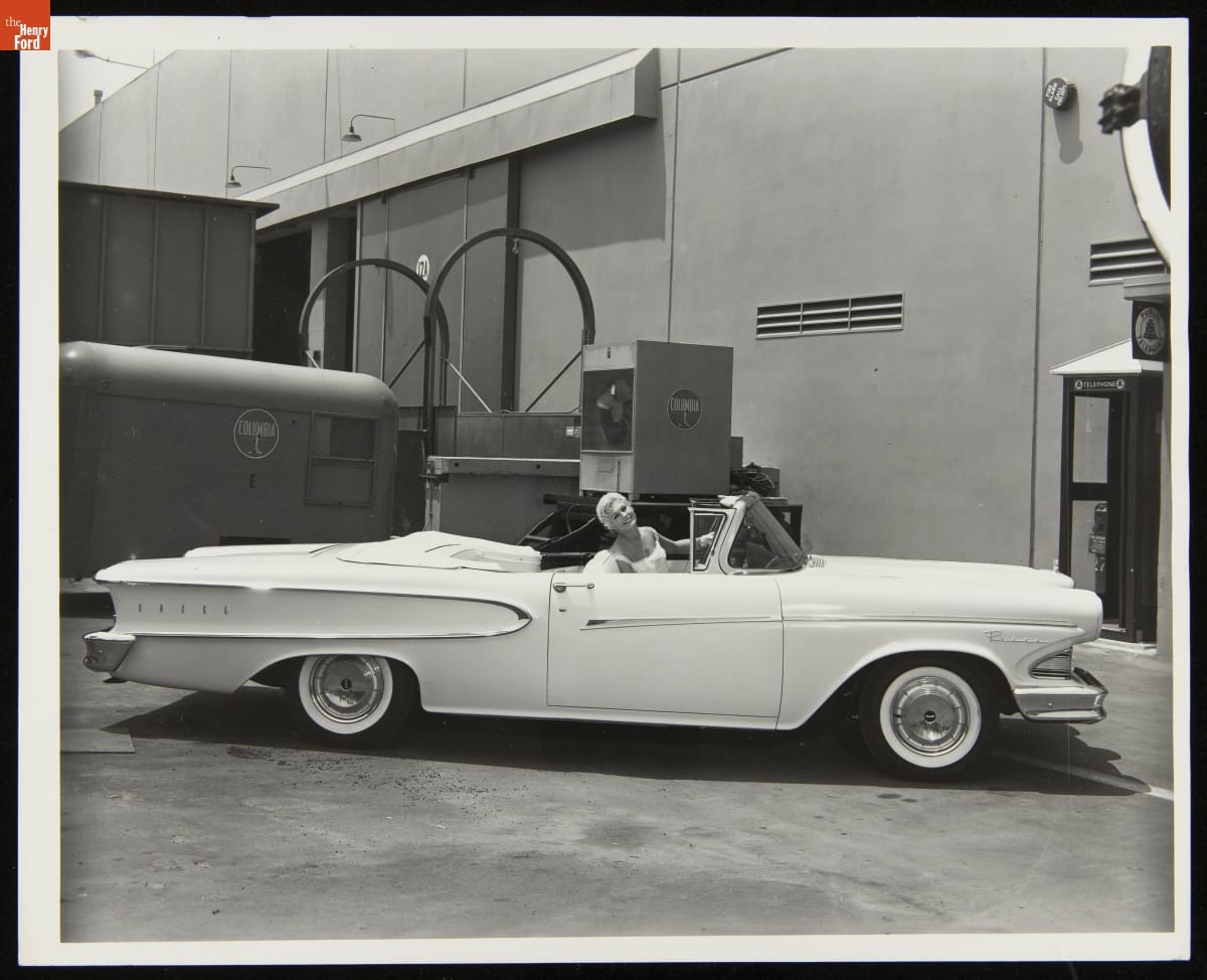 Motion picture actress Kim Novak posed with a 1958 Edsel Pacer convertible for this promotional photograph. Ford Motor Company launched the Edsel with great fanfare, but the brand was not the hit Ford hoped it would be. The Edsel line was discontinued after only three model years.