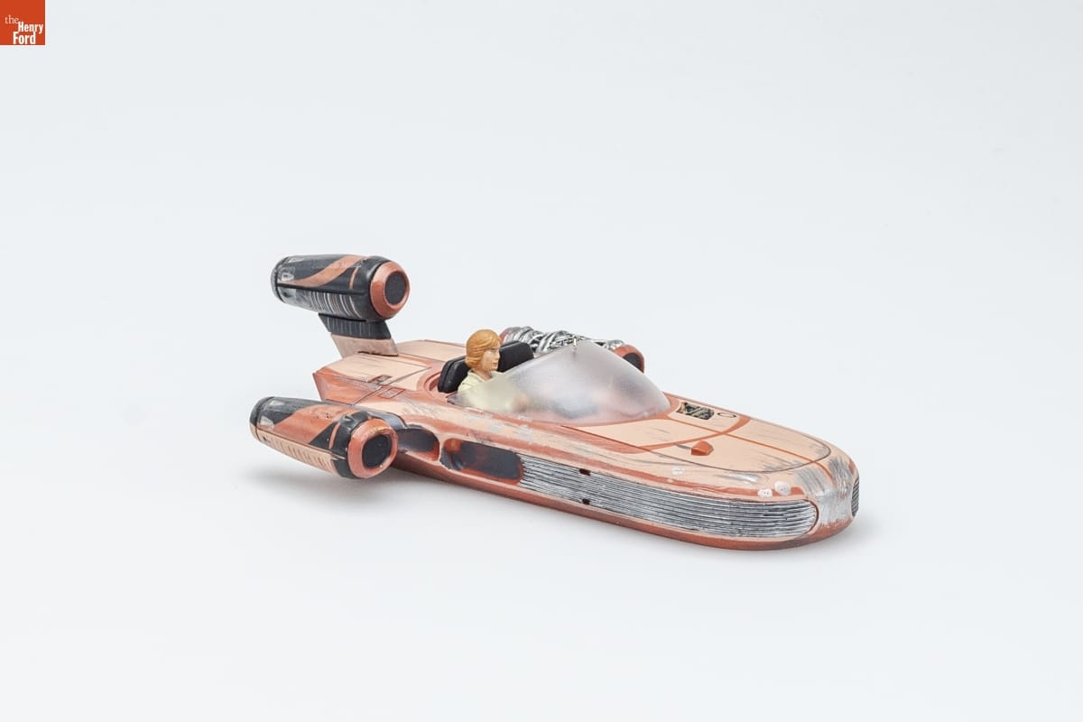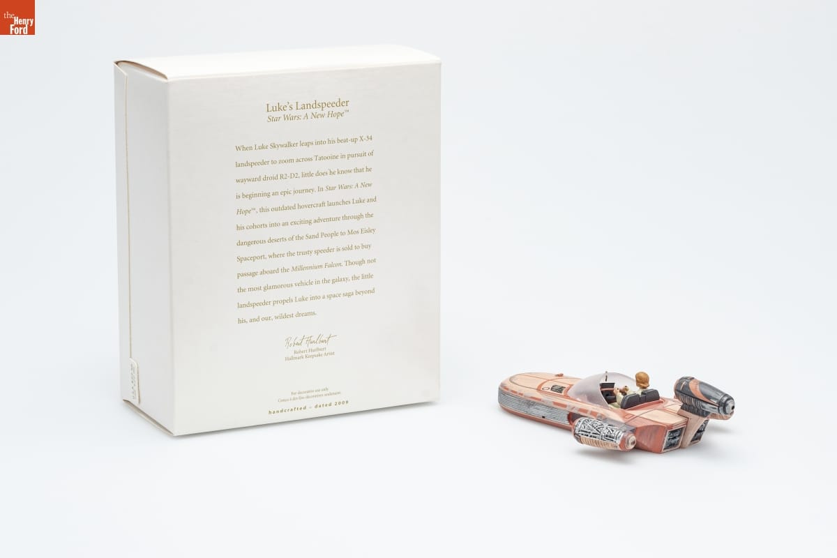 Luke's Landspeeder / Star Wars: A New Hope TM / When Luke Skywalker leaps into his beat-up X-34 / landspeeder to zoom across Tatooine in pursuit of / wayward droid R2-D2, little does he know that he / is beginning an epic journey. In Star Wars: A New / Hope TM, this outdated hovercraft launches Luke and / his cohorts into an exciting adventure through the / dangerous deserts of the Sand People to Mos Eisley / Spaceport, where the trusty speeder is sold to buy / passage aboard the Millennium Falcon. Though not / the most glamourous vehicle in the galaxy, the little / landspeeder propels Luke into a space saga beyond / his, and our, wildest dreams. / Robert Hurlburt / Hallmark Keepsake Artist / For decorative use only. / Concue a des fins decoratives seulement. / handcrafted - dated 2009
