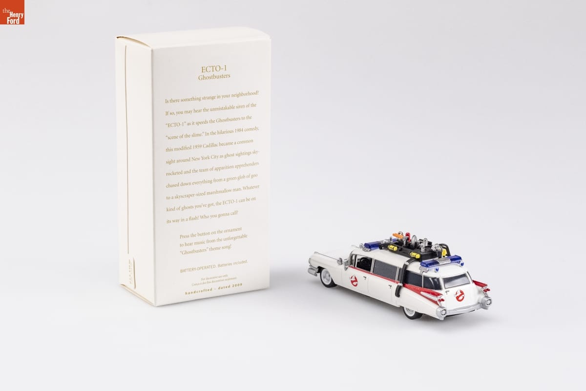 ECTO-1 / Ghostbusters / Is there something strange in your neighborhood? / If so, you may hear the unmistakeable siren of the / "ECTO-1" as it speeds the Ghostbusters to the / "scene of the slime." In the hilarious 1984 comedy, / this modified 1959 Cadillac became a common / sight around New York City as ghost sightings sky-rocketed and the team of apparition apprehenders / chased down everything from a green glob of goo / to a skyscraper-sized marshmallow man. Whatever / kind of ghosts you've got, the ECTO-1 can be on / its way in a flash! Who you gonna call? / Press the button on the ornament / to hear music from the unforgettable / "Ghostbusters" theme song! / BATTERY-OPERATED. Batteries included. / For decorative use only. / Concue a des fins decoratives seulement. / handcrafted - dated 2009
