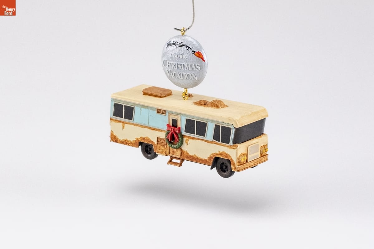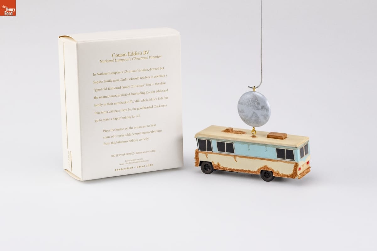 Cousin Eddie's RV / National Lampoon's Christmas Vacation / In National Lampoon's Christmas Vacation, devoted but / hapless family man Clark Griswold resolves to celebrate a / "good old-fashioned family Christmas." Not in the plan: / the unannounced arrival of freeloading Cousin Eddie and / family in their ramshackle RV. Still, when Eddie's kids fear / that Santa will pass them by, the goodhearted Clark steps / up to make a happy holiday for all! / Press the button on the ornament to hear / some of Cousin Eddie's most memorable lines / from this hilarious holiday comedy! / BATTERY-OPERATED. Batteries included. / For decorative use only. / Concue a des fins decoratives seulement. / handcrafted - dated 2009