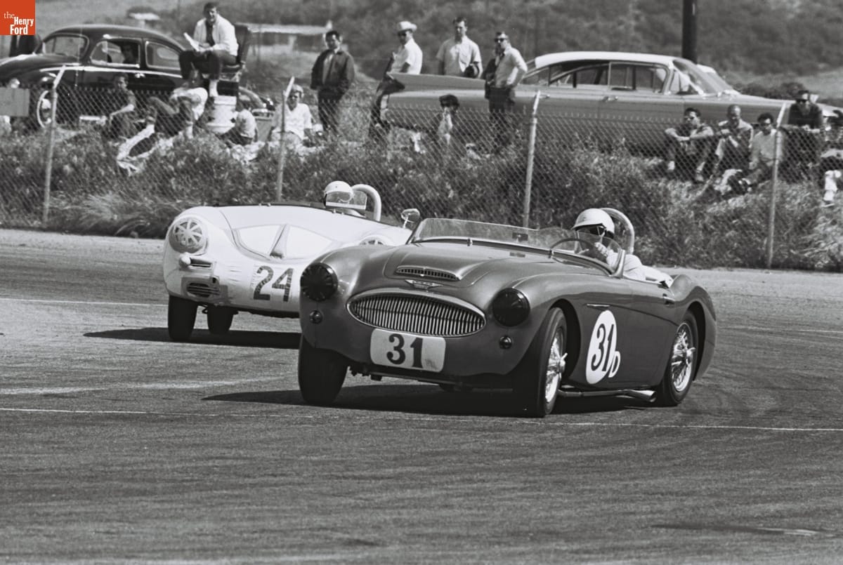 Porsche Driven by Ed Barker and Austin Healey Driven by Ronnie Bucknum in the Del Mar Road Races, April 1962