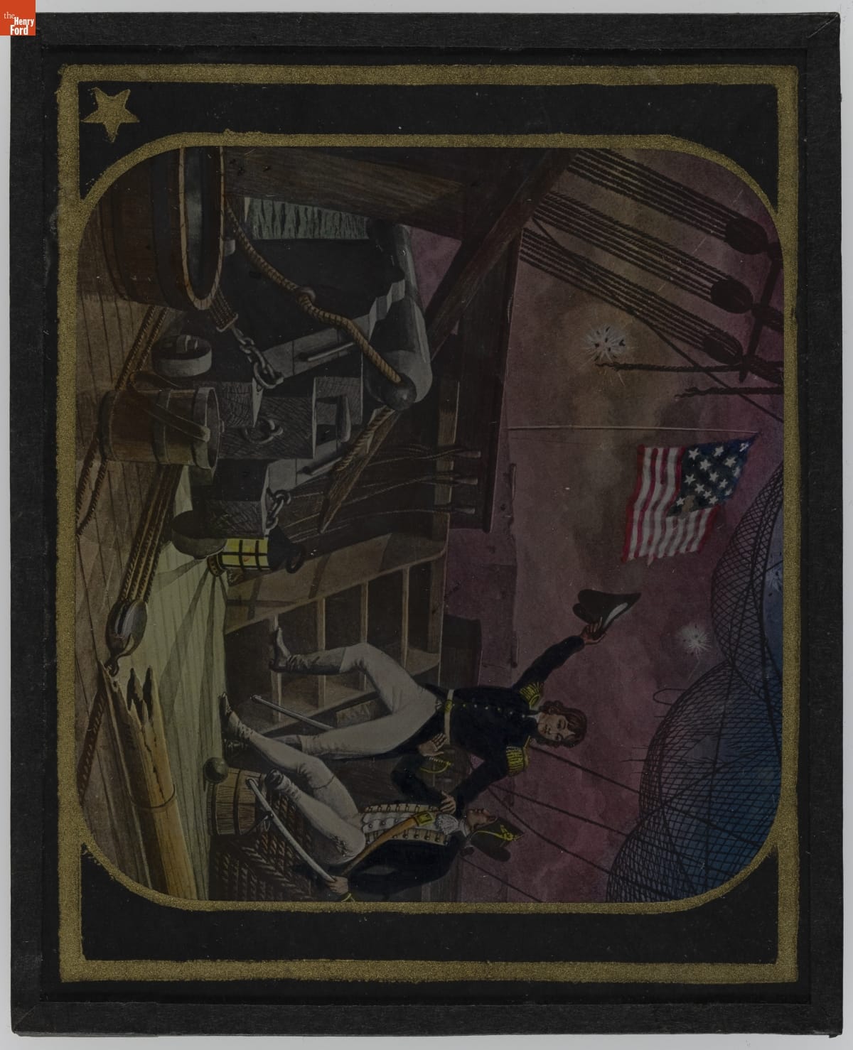 Joseph Boggs Beale (1841-1926) created artwork that was reproduced to make magic lantern slides like this one. His illustrations were photographed onto glass then hand colored. Beale was prolific, producing more than 2000 images used in over 250 different lantern slide sets. This slide was one of six created to illustrate Francis Scott Key's poem "The Star-Spangled Banner."