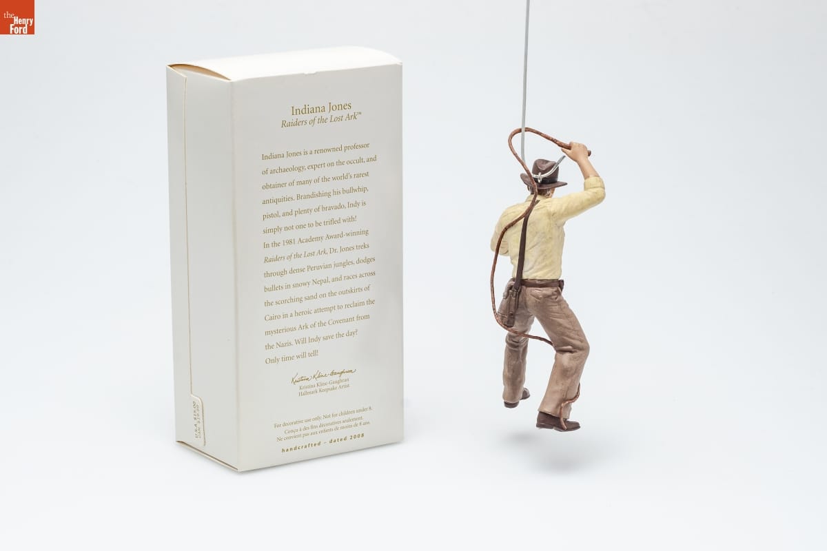 Indiana Jones / Raiders of the Lost Ark / Indiana Jones is a renowned professor / of archaeology, expert on the occult, and / obtainer of many of the world's rarest / antiquities. Brandishing his bullwhip, / pistol, and plenty of bravado, Indy is / simply not one to be trifled with! / In the 1981 Academy Award-winning / Raiders of the Lost Ark, Dr. Jones treks / through dense Peruvian jungles, dodges / bullets in snowy Nepal, and races across / the scorching sand on the outskirts of / Cairo in a heroic attempt to reclaim the / mysterious Ark of the Covenant from / the Nazis. Will Indy save the day? / Only time will tell! / Kristina Kline-Gaughran / Hallmark Keepsake Artist / For decorative use only. Not for children under 8. / Concue a des fins decoratives seulement. / Ne convient pas aux enfants de moins de 8 ans. / handcrafted - dated 2008