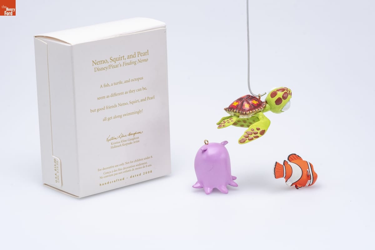 Nemo, Squirt, and Pearl / Disney/Pixar's Finding Nemo / A fish, a turtle and octopus / seem as different as they can be, / but good friends Nemo, Squirt, and Pearl / all get along swimmingly! / Kristina Kline-Gaughran / Hallmark Keepsake Artist / For decorative use only. Not for children under 8. / Concue a des fins decoratives seulement. / Ne convient pas aux enfants de moins de 8 ans. / handcrafted - dated 2008