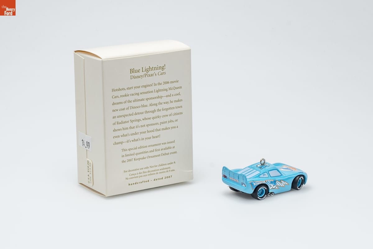 Blue Lightning! / Disney/Pixar's Cars / Hotshots, start your engines! In the 2006 movie / Cars, rookie racing sensation Lightning McQueen / dreams of the ultimate sponsorship--and a cool, / new coat of Dinoco blue. Along the way, he makes / an unexpected detour through the forgotten town / of Radiator Springs, whose quirky crew of citizens / shows him that it's not sponsors, paint jobs, or / even what's under your hood that makes you a / champ--it's what's in your heart! / This special edition ornament was issued / in limited quantities and first available at / the 2007 Keepsake Ornament Debut event. / For decorative use only. Not for children under 8. / Concue a des fins decoratives seulement. / Ne convient pas aux enfants de moins de 8 ans. / handcrafted - dated 2007
