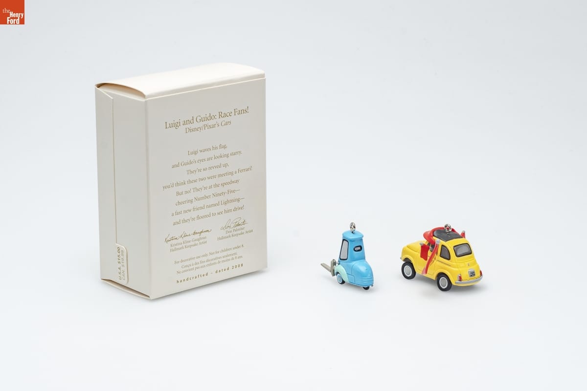 Luigi and Guido: Race Fans! / Disney/Pixar's Cars / Luigi waves his flag, / and Guido's eyes are looking starry. / They're so revved up, / you'd think these two were meeting a Ferrari! / But no! They're at the speedway / cheering Number Ninety-Five-- / a fast new friend named Lightning-- / and they're floored to see him drive! / Kristina Kline Gaughran / Hallmark Keepsake Artist / Don Palmiter / Hallmark Keepsake Artist / For decorative use only. Not for children under 8. / Concue a des fins decoratives seulement. / Ne convient pas aux enfants de moins de 8 ans. / handcrafted - dated 2008